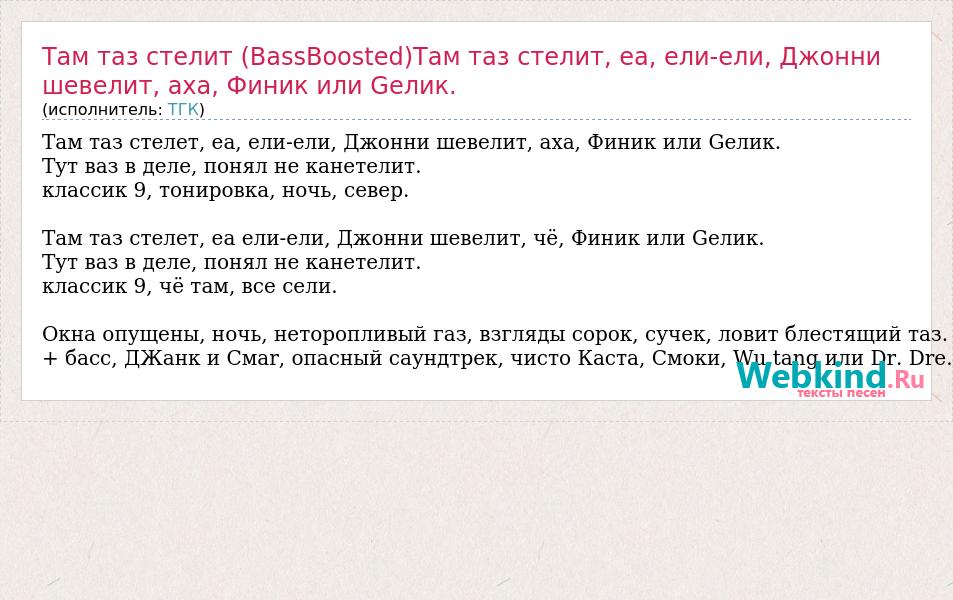 А как ты думаешь, о чем песня "Там таз стелит (BassBoosted)Там таз стелит, еа, ели-ели, Джонни шевелит, " ?