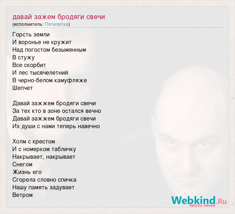Горсть земли И воронье не кружит Над погостом безымянным В стужу Все скорбит И лес тысячелетний В черно-белом камуфляже Шепчет Давай зажжем бродяги свечи За тех кто в зоне остался вечно Давай зажжем бродяги свечи Их души с нами теперь навечно Холм с крестом И с номерком табличку Накрывает, накрывает Снегом Жизнь его Сгорела словно спичка Нашу память задувает Ветром