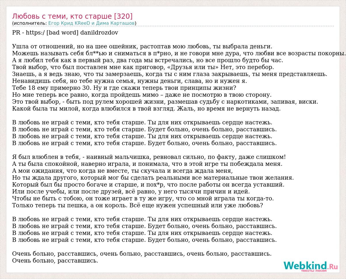 PR - https:/ [bad word] danildrozdov Ушла от отношений, но на шее ошейник, растоптав мою любовь, ты выбрала деньги. Можешь называть себя бл**ью и сниматься в п*рно, и не говори мне дура, что любви все возрасты покорны. А я любил тебя как в первый раз, два года мы встречались, но все прошло будто бы час. Твой выбор, что был поставлен мне как приговор, «Друзья или ты» Нет, это перебор. Знаешь, а я ведь знаю, что ты замерзаешь, когда ты с ним глаза закрываешь, ты меня представляешь. Ненавидишь себя, но тебе нужна семья, нужны деньги, слава, но и нужен я. Тебе 18 ему примерно 30. Ну и где скажи теперь твои принципы жизни? Но мне теперь все равно, когда пройдешь мимо – даже не посмотрю в твою сторону. Это твой выбор, - быть под рулем хорошей жизни, размешав судьбу с наркотиками, запивая, виски. Какой была ты милой, когда влюбился в твой взгляд. Жаль, но время не вернуть назад. В любовь не играй с теми, кто тебя старше. Ты для них открываешь сердце настежь. В любовь не играй с теми, кто тебя старше. Будет больно, очень больно, расставшись. В любовь не играй с теми, кто тебя старше. Ты для них открываешь сердце настежь. В любовь не играй с теми, кто тебя старше. Будет больно, очень больно, расставшись. Я был влюблен в тебя, - наивный мальчишка, ревновал сильно, по факту, даже слишком! А ты была спокойной, наверно играла, и понимала, что в этой игре ты побеждала меня. А мои ожидания, что когда не вместе, ты скучала и всегда ждала меня, Но ты ждала другого, который мог бы сделать реальными все материальные твои желания. Который был бы просто богаче и старше, и пох*р, что после работы он всегда уставший. Или после учебы, или после друзей, всё равно, у него тысячи причин и идей. Чтобы не быть с тобою, он тоже играет в ту же игру, что со мной играла ты когда-то. Только теперь ты пешка, а он король. Всё еще нужен успешный или уже любовь? В любовь не играй с теми, кто тебя старше. Ты для них открываешь сердце настежь. В любовь не играй с теми, кто тебя старше. Будет больно, очень больно, расставшись. В любовь не играй с теми, кто тебя старше. Ты для них открываешь сердце настежь. В любовь не играй с теми, кто тебя старше. Будет больно, очень больно, расставшись. Очень больно, расставшись, очень больно, расставшись, очень больно, расставшись. Очень больно, расставшись.
