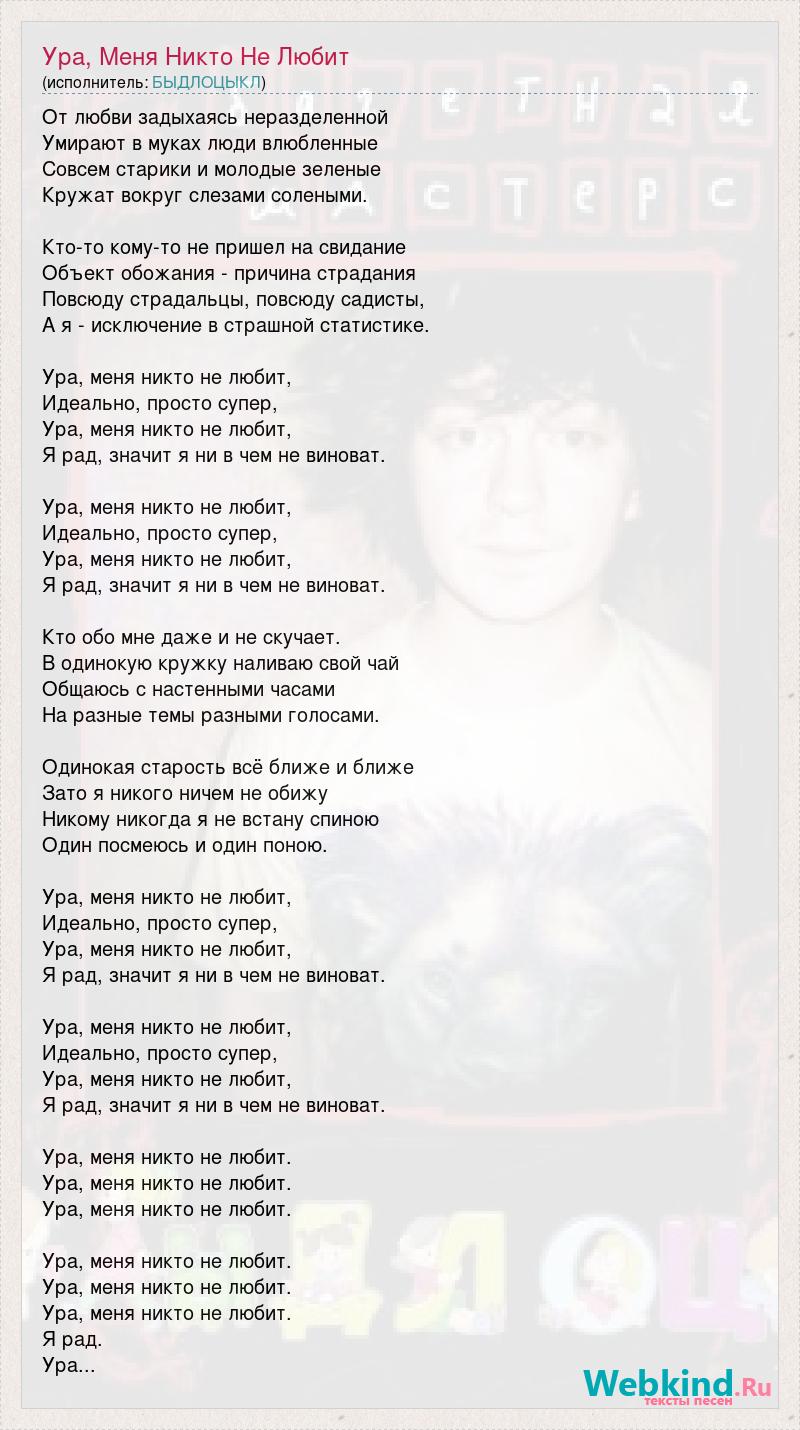 От любви задыхаясь неразделенной Умирают в муках люди влюбленные Совсем старики и молодые зеленые Кружат вокруг слезами солеными. Кто-то кому-то не пришел на свидание Объект обожания - причина страдания Повсюду страдальцы, повсюду садисты, А я - исключение в страшной статистике. Ура, меня никто не любит, Идеально, просто супер, Ура, меня никто не любит, Я рад, значит я ни в чем не виноват. Ура, меня никто не любит, Идеально, просто супер, Ура, меня никто не любит, Я рад, значит я ни в чем не виноват. Кто обо мне даже и не скучает. В одинокую кружку наливаю свой чай Общаюсь с настенными часами На разные темы разными голосами. Одинокая старость всё ближе и ближе Зато я никого ничем не обижу Никому никогда я не встану спиною Один посмеюсь и один поною. Ура, меня никто не любит, Идеально, просто супер, Ура, меня никто не любит, Я рад, значит я ни в чем не виноват. Ура, меня никто не любит, Идеально, просто супер, Ура, меня никто не любит, Я рад, значит я ни в чем не виноват. Ура, меня никто не любит. Ура, меня никто не любит. Ура, меня никто не любит. Ура, меня никто не любит. Ура, меня никто не любит. Ура, меня никто не любит. Я рад. Ура...