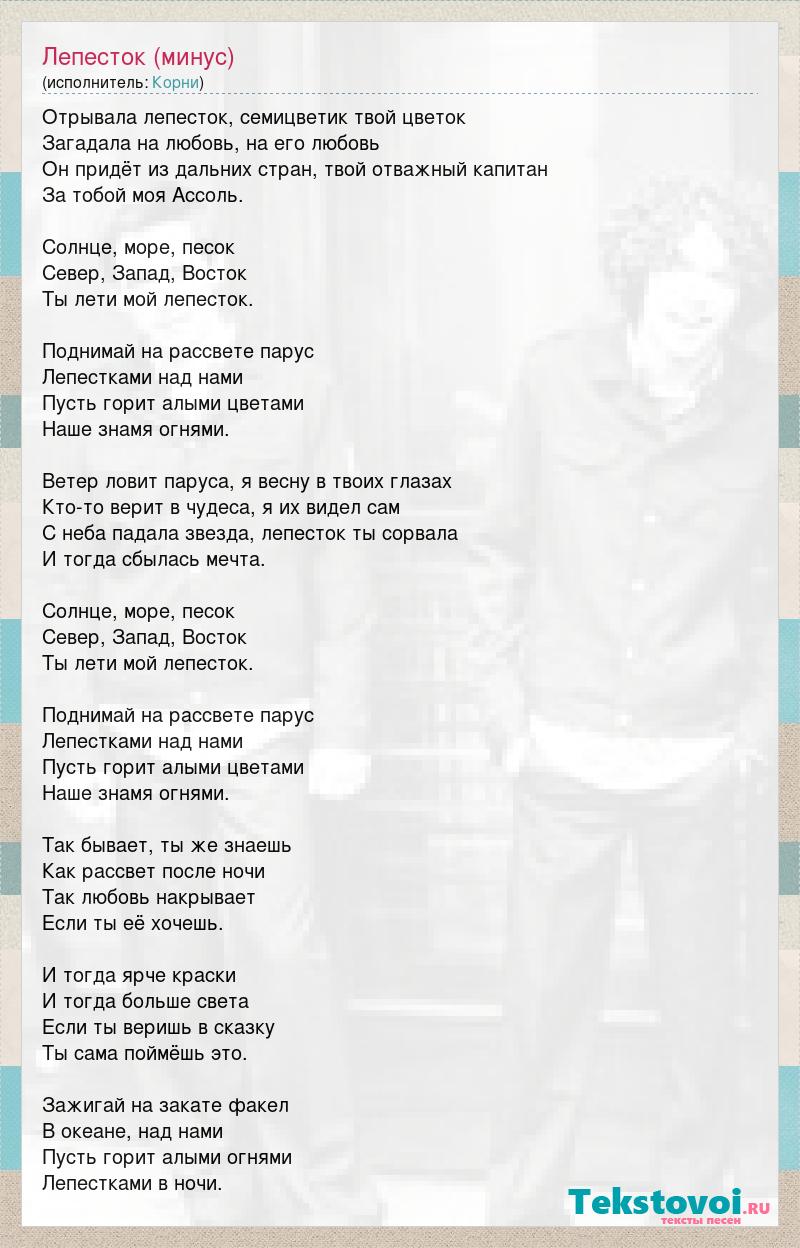 Отрывала лепесток, семицветик твой цветок Загадала на любовь, на его любовь Он придёт из дальних стран, твой отважный капитан За тобой моя Ассоль. Солнце, море, песок Север, Запад, Восток Ты лети мой лепесток. Поднимай на рассвете парус Лепестками над нами Пусть горит алыми цветами Наше знамя огнями. Ветер ловит паруса, я весну в твоих глазах Кто-то верит в чудеса, я их видел сам С неба падала звезда, лепесток ты сорвала И тогда сбылась мечта. Солнце, море, песок Север, Запад, Восток Ты лети мой лепесток. Поднимай на рассвете парус Лепестками над нами Пусть горит алыми цветами Наше знамя огнями. Так бывает, ты же знаешь Как рассвет после ночи Так любовь накрывает Если ты её хочешь. И тогда ярче краски И тогда больше света Если ты веришь в сказку Ты сама поймёшь это. Зажигай на закате факел В океане, над нами Пусть горит алыми огнями Лепестками в ночи.