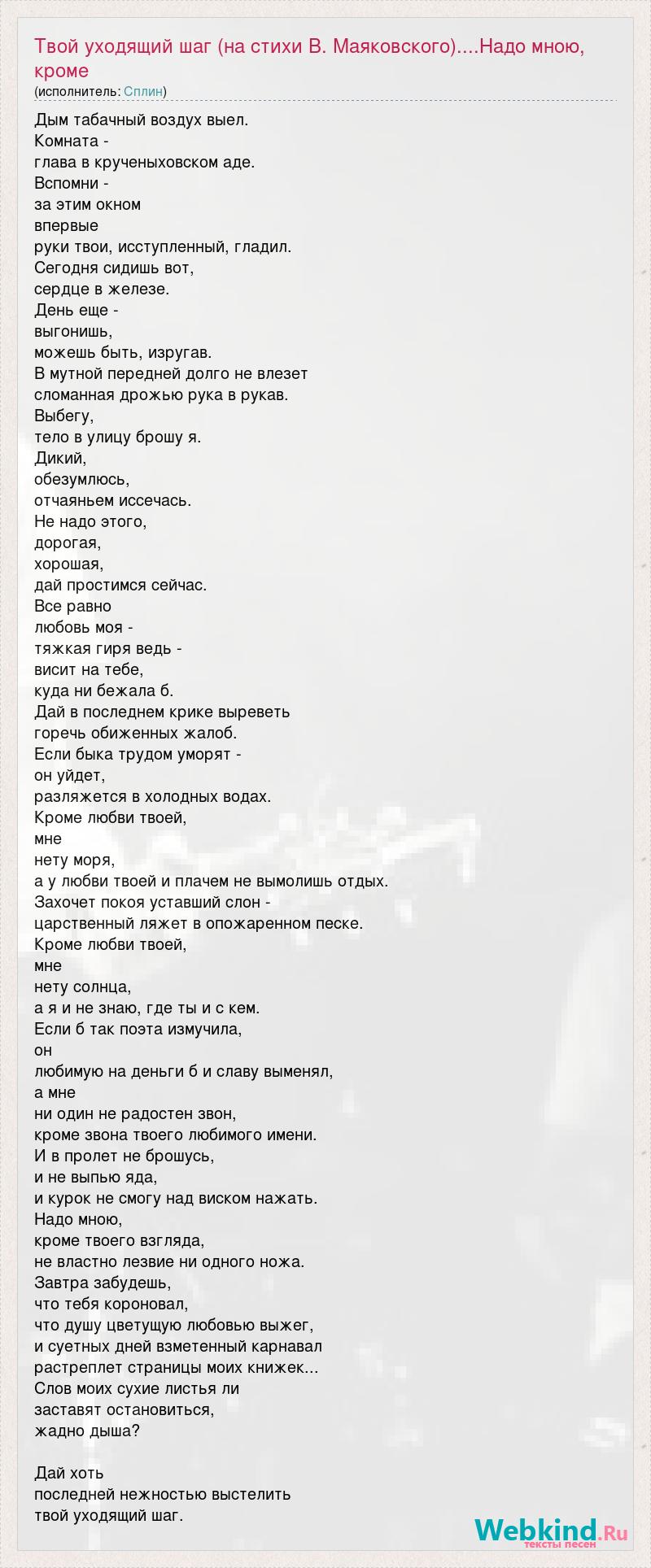 Главная→Исполнители→Сплин→Твой уходящий шаг (на стихи В. Маяковского)....Надо мною, кроме твоего взгляда,