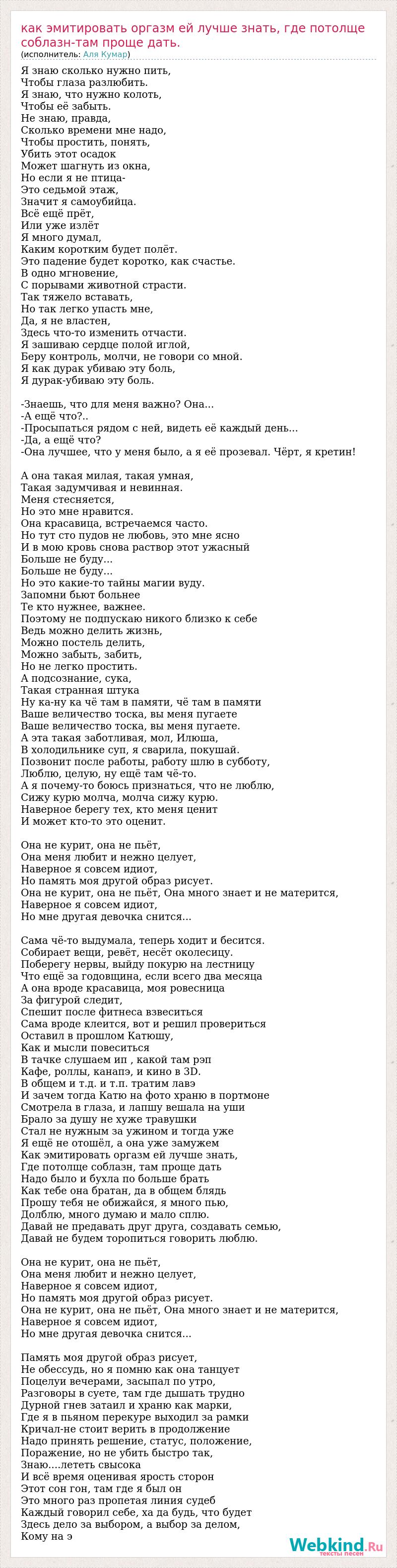 Я знаю сколько нужно пить, Чтобы глаза разлюбить. Я знаю, что нужно колоть, Чтобы её забыть. Не знаю, правда, Сколько времени мне надо, Чтобы простить, понять, Убить этот осадок Может шагнуть из окна, Но если я не птица- Это седьмой этаж, Значит я самоубийца. Всё ещё прёт, Или уже излёт Я много думал, Каким коротким будет полёт. Это падение будет коротко, как счастье. В одно мгновение, С порывами животной страсти. Так тяжело вставать, Но так легко упасть мне, Да, я не властен, Здесь что-то изменить отчасти. Я зашиваю сердце полой иглой, Беру контроль, молчи, не говори со мной. Я как дурак убиваю эту боль, Я дурак-убиваю эту боль. -Знаешь, что для меня важно? Она... -А ещё что?.. -Просыпаться рядом с ней, видеть её каждый день... -Да, а ещё что? -Она лучшее, что у меня было, а я её прозевал. Чёрт, я кретин! А она такая милая, такая умная, Такая задумчивая и невинная. Меня стесняется, Но это мне нравится. Она красавица, встречаемся часто. Но тут сто пудов не любовь, это мне ясно И в мою кровь снова раствор этот ужасный Больше не буду... Больше не буду... Но это какие-то тайны магии вуду. Запомни бьют больнее Те кто нужнее, важнее. Поэтому не подпускаю никого близко к себе Ведь можно делить жизнь, Можно постель делить, Можно забыть, забить, Но не легко простить. А подсознание, сука, Такая странная штука Ну ка-ну ка чё там в памяти, чё там в памяти Ваше величество тоска, вы меня пугаете Ваше величество тоска, вы меня пугаете. А эта такая заботливая, мол, Илюша, В холодильнике суп, я сварила, покушай. Позвонит после работы, работу шлю в субботу, Люблю, целую, ну ещё там чё-то. А я почему-то боюсь признаться, что не люблю, Сижу курю молча, молча сижу курю. Наверное берегу тех, кто меня ценит И может кто-то это оценит. Она не курит, она не пьёт, Она меня любит и нежно целует, Наверное я совсем идиот, Но память моя другой образ рисует. Она не курит, она не пьёт, Она много знает и не матерится, Наверное я совсем идиот, Но мне другая девочка снится... Сама чё-то выдумала, теперь ходит и бесится. Собирает вещи, ревёт, несёт околесицу. Поберегу нервы, выйду покурю на лестницу Что ещё за годовщина, если всего два месяца А она вроде красавица, моя ровесница За фигурой следит, Спешит после фитнеса взвеситься Сама вроде клеится, вот и решил провериться Оставил в прошлом Катюшу, Как и мысли повеситься В тачке слушаем ип , какой там рэп Кафе, роллы, канапэ, и кино в 3D. В общем и т.д. и т.п. тратим лавэ И зачем тогда Катю на фото храню в портмоне Смотрела в глаза, и лапшу вешала на уши Брало за душу не хуже травушки Стал не нужным за ужином и тогда уже Я ещё не отошёл, а она уже замужем Как эмитировать оргазм ей лучше знать, Где потолще соблазн, там проще дать Надо было и бухла по больше брать Как тебе она братан, да в общем блядь Прошу тебя не обижайся, я много пью, Долблю, много думаю и мало сплю. Давай не предавать друг друга, создавать семью, Давай не будем торопиться говорить люблю. Она не курит, она не пьёт, Она меня любит и нежно целует, Наверное я совсем идиот, Но память моя другой образ рисует. Она не курит, она не пьёт, Она много знает и не матерится, Наверное я совсем идиот, Но мне другая девочка снится... Память моя другой образ рисует, Не обессудь, но я помню как она танцует Поцелуи вечерами, засыпал по утро, Разговоры в суете, там где дышать трудно Дурной гнев затаил и храню как марки, Где я в пьяном перекуре выходил за рамк