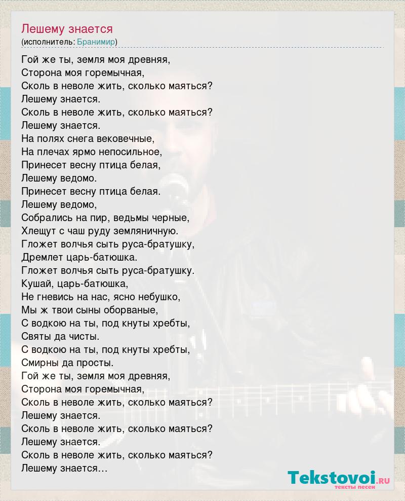 Гой же ты, земля моя древняя, Сторона моя горемычная, Сколь в неволе жить, сколько маяться? Лешему знается. Сколь в неволе жить, сколько маяться? Лешему знается. На полях снега вековечные, На плечах ярмо непосильное, Принесет весну птица белая, Лешему ведомо. Принесет весну птица белая. Лешему ведомо, Собрались на пир, ведьмы черные, Хлещут с чаш руду земляничную. Гложет волчья сыть руса-братушку, Дремлет царь-батюшка. Гложет волчья сыть руса-братушку. Кушай, царь-батюшка, Не гневись на нас, ясно небушко, Мы ж твои сыны оборваные, С водкою на ты, под кнуты хребты, Святы да чисты. С водкою на ты, под кнуты хребты, Смирны да просты. Гой же ты, земля моя древняя, Сторона моя горемычная, Сколь в неволе жить, сколько маяться? Лешему знается. Сколь в неволе жить, сколько маяться? Лешему знается. Сколь в неволе жить, сколько маяться? Лешему знается…