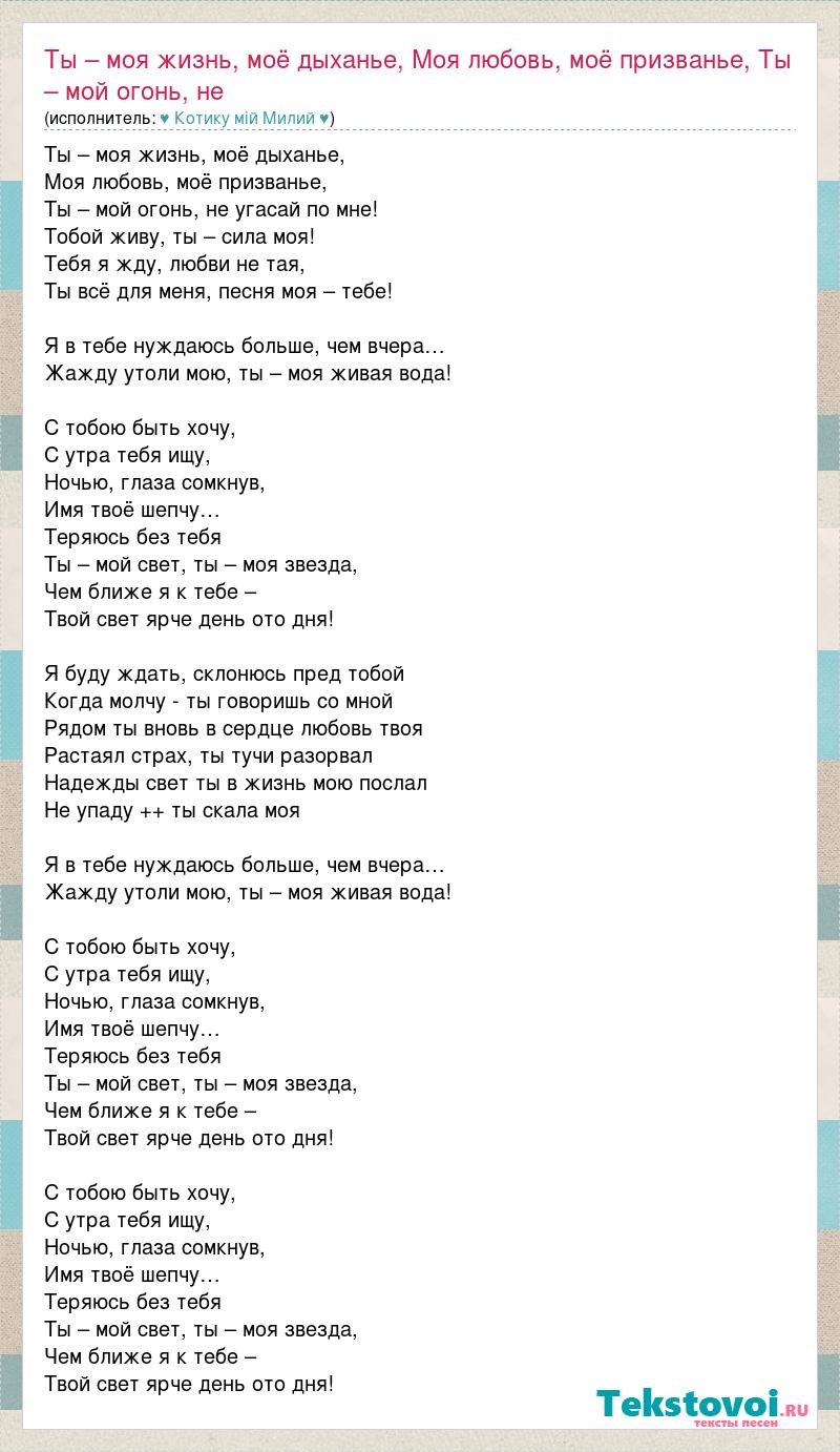 Ты – моя жизнь, моё дыханье, Моя любовь, моё призванье, Ты – мой огонь, не угасай по мне! Тобой живу, ты – сила моя! Тебя я жду, любви не тая, Ты всё для меня, песня моя – тебе! Я в тебе нуждаюсь больше, чем вчера… Жажду утоли мою, ты – моя живая вода! С тобою быть хочу, С утра тебя ищу, Ночью, глаза сомкнув, Имя твоё шепчу… Теряюсь без тебя Ты – мой свет, ты – моя звезда, Чем ближе я к тебе – Твой свет ярче день ото дня! Я буду ждать, склонюсь пред тобой Когда молчу - ты говоришь со мной Рядом ты вновь в сердце любовь твоя Растаял страх, ты тучи разорвал Надежды свет ты в жизнь мою послал Не упаду ++ ты скала моя Я в тебе нуждаюсь больше, чем вчера… Жажду утоли мою, ты – моя живая вода! С тобою быть хочу, С утра тебя ищу, Ночью, глаза сомкнув, Имя твоё шепчу… Теряюсь без тебя Ты – мой свет, ты – моя звезда, Чем ближе я к тебе – Твой свет ярче день ото дня! С тобою быть хочу, С утра тебя ищу, Ночью, глаза сомкнув, Имя твоё шепчу… Теряюсь без тебя Ты – мой свет, ты – моя звезда, Чем ближе я к тебе – Твой свет ярче день ото дня!