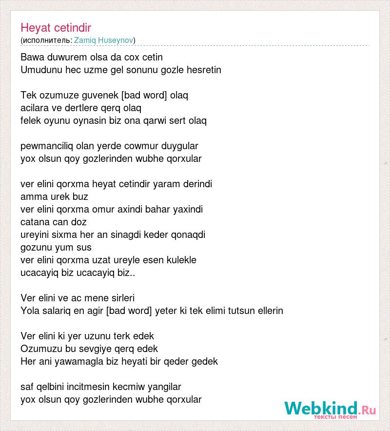 Bawa duwurem olsa da cox cetin Umudunu hec uzme gel sonunu gozle hesretin Tek ozumuze guvenek [bad word] olaq acilara ve dertlere qerq olaq felek oyunu oynasin biz ona qarwi sert olaq pewmanciliq olan yerde cowmur duygular yox olsun qoy gozlerinden wubhe qorxular ver elini qorxma heyat cetindir yaram derindi amma urek buz ver elini qorxma omur axindi bahar yaxindi catana can doz ureyini sixma her an sinagdi keder qonaqdi gozunu yum sus ver elini qorxma uzat ureyle esen kulekle ucacayiq biz ucacayiq biz.. Ver elini ve ac mene sirleri Yola salariq en agir [bad word] yeter ki tek elimi tutsun ellerin Ver elini ki yer uzunu terk edek Ozumuzu bu sevgiye qerq edek Her ani yawamagla biz heyati bir qeder gedek saf qelbini incitmesin kecmiw yangilar yox olsun qoy gozlerinden wubhe qorxular