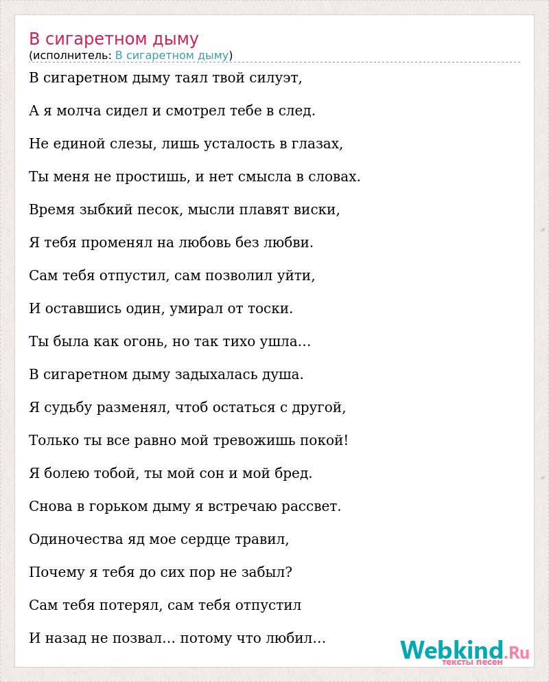 В сигаретном дыму таял твой силуэт, А я молча сидел и смотрел тебе в след. Не единой слезы, лишь усталость в глазах, Ты меня не простишь, и нет смысла в словах. Время зыбкий песок, мысли плавят виски, Я тебя променял на любовь без любви. Сам тебя отпустил, сам позволил уйти, И оставшись один, умирал от тоски. Ты была как огонь, но так тихо ушла… В сигаретном дыму задыхалась душа. Я судьбу разменял, чтоб остаться с другой, Только ты все равно мой тревожишь покой! Я болею тобой, ты мой сон и мой бред. Снова в горьком дыму я встречаю рассвет. Одиночества яд мое сердце травил, Почему я тебя до сих пор не забыл? Сам тебя потерял, сам тебя отпустил И назад не позвал… потому что любил…