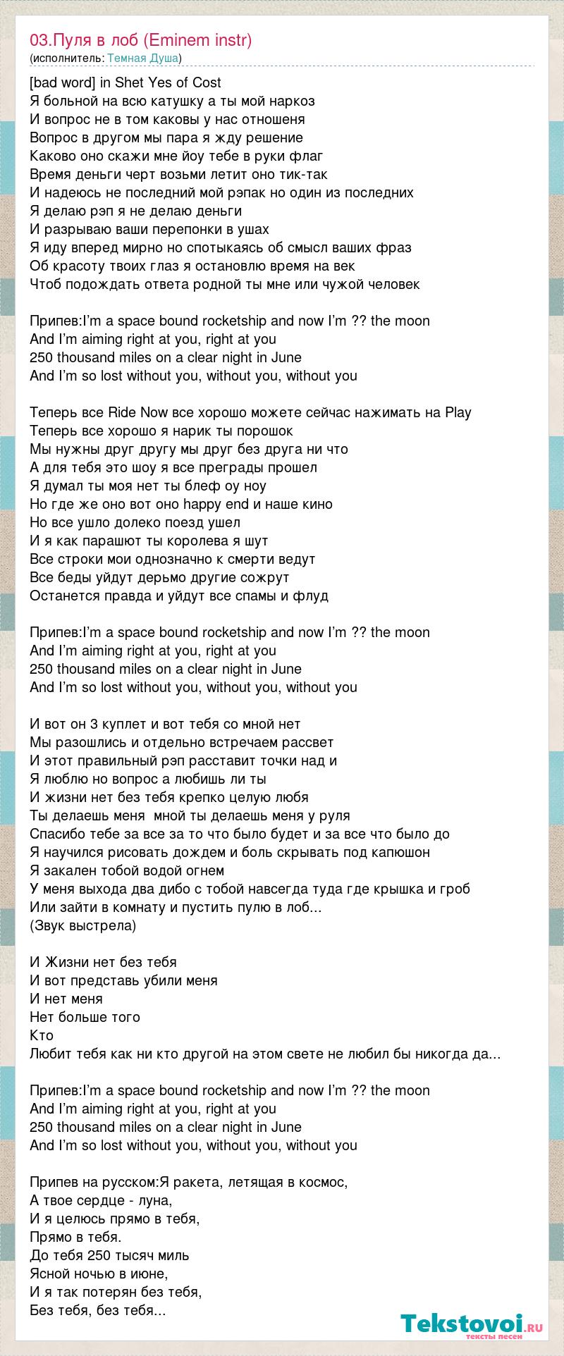 [bad word] in Shet Yes of Cost Я больной на всю катушку а ты мой наркоз И вопрос не в том каковы у нас отношеня Вопрос в другом мы пара я жду решение Каково оно скажи мне йоу тебе в руки флаг Время деньги черт возьми летит оно тик-так И надеюсь не последний мой рэпак но один из последних Я делаю рэп я не делаю деньги И разрываю ваши перепонки в ушах Я иду вперед мирно но спотыкаясь об смысл ваших фраз Об красоту твоих глаз я остановлю время на век Чтоб подождать ответа родной ты мне или чужой человек Припев:I’m a space bound rocketship and now I’m ?? the moon And I’m aiming right at you, right at you 250 thousand miles on a clear night in June And I’m so lost without you, without you, without you Теперь все Ride Now все хорошо можете сейчас нажимать на Play Теперь все хорошо я нарик ты порошок Мы нужны друг другу мы друг без друга ни что А для тебя это шоу я все преграды прошел Я думал ты моя нет ты блеф оу ноу Но где же оно вот оно happy end и наше кино Но все ушло долеко поезд ушел И я как парашют ты королева я шут Все строки мои однозначно к смерти ведут Все беды уйдут дерьмо другие сожрут Останется правда и уйдут все спамы и флуд Припев:I’m a space bound rocketship and now I’m ?? the moon And I’m aiming right at you, right at you 250 thousand miles on a clear night in June And I’m so lost without you, without you, without you И вот он 3 куплет и вот тебя со мной нет Мы разошлись и отдельно встречаем рассвет И этот правильный рэп расставит точки над и Я люблю но вопрос а любишь ли ты И жизни нет без тебя крепко целую любя Ты делаешь меня мной ты делаешь меня у руля Спасибо тебе за все за то что было будет и за все что было до Я научился рисовать дождем и боль скрывать под капюшон Я закален тобой водой огнем У меня выхода два дибо с тобой навсегда туда где крышка и гроб Или зайти в комнату и пустить пулю в лоб... (Звук выстрела) И Жизни нет без тебя И вот представь убили меня И нет меня Нет больше того Кто Любит тебя как ни кто другой на этом свете не любил бы никогда да... Припев:I’m a space bound rocketship and now I’m ?? the moon And I’m aiming right at you, right at you 250 thousand miles on a clear night in June And I’m so lost without you, without you, without you Припев на русском:Я ракета, летящая в космос, А твое сердце - луна, И я целюсь прямо в тебя, Прямо в тебя. До тебя 250 тысяч миль Ясной ночью в июне, И я так потерян без тебя, Без тебя, без тебя...