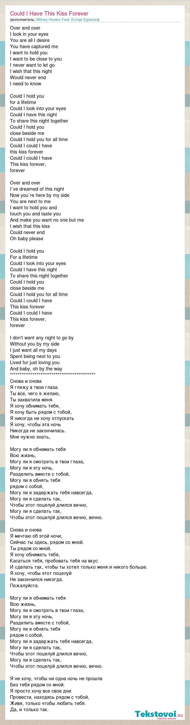 Over and over I look in your eyes You are all I desire You have captured me I want to hold you I want to be close to you I never want to let go I wish that this night Would never end I need to know Could I hold you for a lifetime Could I look into your eyes Could I have this night To share this night together Could I hold you close beside me Could I hold you for all time Could I could I have this kiss forever Could I could I have This kiss forever, forever Over and over I`ve dreamed of this night Now you`re here by my side You are next to me I want to hold you and touch you and taste you And make you want no one but me I wish that this kiss Could never end Oh baby please Could I hold you For a lifetime Could I look into your eyes Could I have this night To share this night together Could I hold you close beside me Could I hold you for all time Could I could I have This kiss forever Could I could I have This kiss forever, forever I don’t want any night to go by Without you by my side I just want all my days Spent being next to you Lived for just loving you And baby, oh by the way ********************************************* Снова и снова Я гляжу в твои глаза. Ты все, чего я желаю, Ты захватила меня. Я хочу обнимать тебя, Я хочу быть рядом с тобой, Я никогда не хочу отпускать Я хочу, чтобы эта ночь Никогда не закончилась. Мне нужно знать, Могу ли я обнимать тебя Всю жизнь, Могу ли я смотреть в твои глаза, Могу ли я эту ночь, Разделить вместе с тобой, Могу ли я обнять тебя рядом с собой, Могу ли я задержать тебя навсегда, Могу ли я сделать так, Чтобы этот поцелуй длился вечно, Могу ли я сделать так, Чтобы этот поцелуй длился вечно, вечно. Снова и снова Я мечтаю об этой ночи, Сейчас ты здесь, рядом со мной. Ты рядом со мной. Я хочу обнимать тебя, Касаться тебя, пробовать тебя на вкус. И сделать так, чтобы ты хотел только меня и никого больше. Я хочу, чтобы этот поцелуй Не закончился никогда. Пожалуйста. Могу ли я обнимать тебя Всю жизнь, Могу ли я смотреть в твои глаза, Могу ли я эту ночь, Разделить вместе с тобой, Могу ли я обнять тебя рядом с собой, Могу ли я задержать тебя навсегда, Могу ли я сделать так, Чтобы этот поцелуй длился вечно, Могу ли я сделать так, Чтобы этот поцелуй длился вечно, вечно. Я не хочу, чтобы ни одна ночь не прошла Без тебя рядом со мной. Я просто хочу все свои дни Провести, находясь рядом с тобой, Живя, только чтобы любить тебя. Да, и только так.