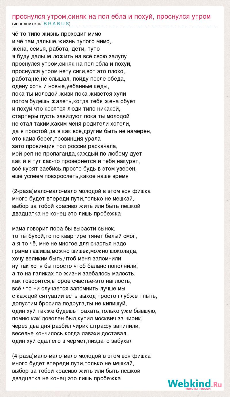 чё-то типо жизнь проходит мимо и чё там дальше,жизнь тупого мимо, жена, семья, работа, дети, тупо я буду дальше ложить на всё свою залупу проснулся утром,синяк на пол ебла и похуй, проснулся утром нету сиги,вот это плохо, работа,не,не слышал, пойду после обеда, одену хоть и новые,уебанные кеды, пока ты молодой живи пока живется хули потом будешь жалеть,когда тебя жена обует и похуй что косятся люди типо никакой, старперы пусть завидуют пока ты молодой не стал таким,каким меня родители хотели, да я простой,да я как все,другим быть не намерен, это кама берег,провинция урала зато провинция пол россии раскачала, мой реп не пропаганда,каждый по любому дует как и я тут как-то провернется и тебя накурят, всё курят заебись,просто будь в этом уверен, ещё успеем повзрослеть,какое наше время (2-раза)мало-мало-мало молодой в этом вся фишка много будет впереди пути,только не мешкай, выбор за тобой красиво жить или быть пешкой двадцатка не конец это лишь пробежка мама говорит пора бы вырасти сынок, то ты бухой,то по квартире тянет белый смог, а я то чё, мне не многое для счастья надо грамм гашиша,можно шишек,можно шоколада, хочу великим быть,чтоб меня запомнили ну так хотя бы просто чтоб баланс пополнили, а то на галиках по жизни заебалось малость, как говорится,второе счастье-это наглость, всё что ни случается запомнить лучше мы с каждой ситуации есть выход просто глубже плыть, допустим бросила подруга,ты не кипишуй, один хуй также будешь трахать,только уже бывшую, помню как доволен был,купил москвич за чирик, через два дня разбил чирик штрафу запилили, веселье кончилось,когда лавэхи доставал, один хуй сдал его в чермет,пиздато забухал (4-раза)мало-мало-мало молодой в этом вся фишка много будет впереди пути,только не мешкай, выбор за тобой красиво жить или быть пешкой двадцатка не конец это лишь пробежка