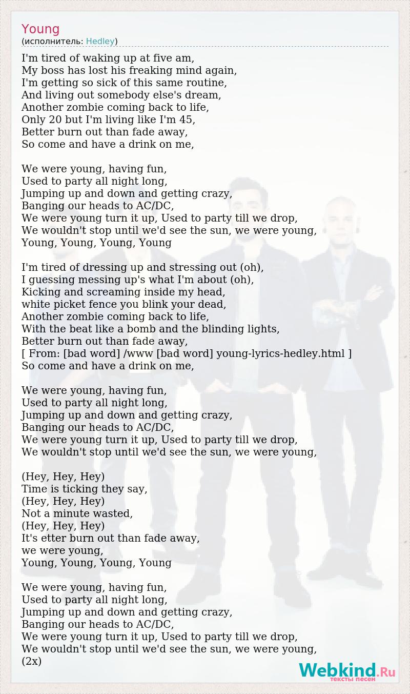 I'm tired of waking up at five am, My boss has lost his freaking mind again, I'm getting so sick of this same routine, And living out somebody else's dream, Another zombie coming back to life, Only 20 but I'm living like I'm 45, Better burn out than fade away, So come and have a drink on me, We were young, having fun, Used to party all night long, Jumping up and down and getting crazy, Banging our heads to AC/DC, We were young turn it up, Used to party till we drop, We wouldn't stop until we'd see the sun, we were young, Young, Young, Young, Young I'm tired of dressing up and stressing out (oh), I guessing messing up's what I'm about (oh), Kicking and screaming inside my head, white picket fence you blink your dead, Another zombie coming back to life, With the beat like a bomb and the blinding lights, Better burn out than fade away, [ From: [bad word] /www [bad word] young-lyrics-hedley.html ] So come and have a drink on me, We were young, having fun, Used to party all night long, Jumping up and down and getting crazy, Banging our heads to AC/DC, We were young turn it up, Used to party till we drop, We wouldn't stop until we'd see the sun, we were young, (Hey, Hey, Hey) Time is ticking they say, (Hey, Hey, Hey) Not a minute wasted, (Hey, Hey, Hey) It's etter burn out than fade away, we were young, Young, Young, Young, Young We were young, having fun, Used to party all night long, Jumping up and down and getting crazy, Banging our heads to AC/DC, We were young turn it up, Used to party till we drop, We wouldn't stop until we'd see the sun, we were young, (2x)