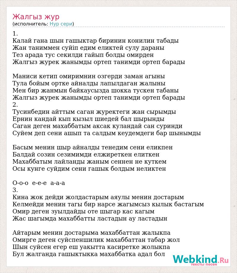 1. Калай гана шын гашыктар биринин конилин табады Жан таниммен суйiп едим еликтей сулу дараны Тез арада тус секилди гайып болды омирден Жалгыз журек жанымды ортеп танимди ортеп барады Маниси кетип омиримнин озгерди заман агыны Тула бойым ортке айналды лапылдаган жалыны Мен бир жанмын байкаусызда шокка тускен табаны Жалгыз журек жанымды ортеп танимди ортеп барады 2. Тусинбедин айттым саган журектеги жан сырымды Ернин кандай кып кызыл шиедей бал шырынды Саган деген махаббатым аксак куландай сан суринди Суйем деп сени ашып та салдым кеудемдеги бар шынымды Басым менин шыр айналды тенедим сени еликпен Балдай созин сезимимди елжиреткен елиткен Махаббатым лайланды жаным сеннен не куткем Осы кунге суйдим сени гашык болдым неликтен О-о-о е-е-е а-а-а 3. Кина жок дейди жолдастарым аяулы менин достарым Келмейди менин тагы бир нарсе жагымсыз кылык бастагым Омир деген зуылдайды оте шыгар кас кагым Жас шагымда махаббатты ластадын ау ластадын Айтарым менин достарыма махаббаттан жалыкпа Омирге деген суйспеншилик махаббаттан табар жол Шын суйсен егер еш уакытта касиретке жолыкпа Бул жалганда гашыктыкка махаббатка адал бол