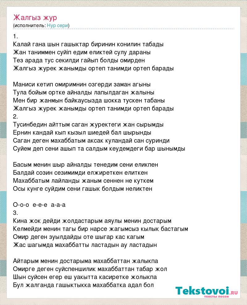 1. Калай гана шын гашыктар биринин конилин табады Жан таниммен суйiп едим еликтей сулу дараны Тез арада тус секилди гайып болды омирден Жалгыз журек жанымды ортеп танимди ортеп барады Маниси кетип омиримнин озгерди заман агыны Тула бойым ортке айналды лапылдаган жалыны Мен бир жанмын байкаусызда шокка тускен табаны Жалгыз журек жанымды ортеп танимди ортеп барады 2. Тусинбедин айттым саган журектеги жан сырымды Ернин кандай кып кызыл шиедей бал шырынды Саган деген махаббатым аксак куландай сан суринди Суйем деп сени ашып та салдым кеудемдеги бар шынымды Басым менин шыр айналды тенедим сени еликпен Балдай созин сезимимди елжиреткен елиткен Махаббатым лайланды жаным сеннен не куткем Осы кунге суйдим сени гашык болдым неликтен О-о-о е-е-е а-а-а 3. Кина жок дейди жолдастарым аяулы менин достарым Келмейди менин тагы бир нарсе жагымсыз кылык бастагым Омир деген зуылдайды оте шыгар кас кагым Жас шагымда махаббатты ластадын ау ластадын Айтарым менин достарыма махаббаттан жалыкпа Омирге деген суйспеншилик махаббаттан табар жол Шын суйсен егер еш уакытта касиретке жолыкпа Бул жалганда гашыктыкка махаббатка адал бол