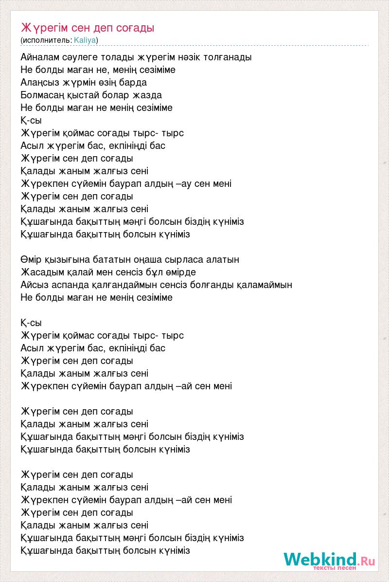 Айналам сәулеге толады жүрегім нәзік толғанады Не болды маған не, менің сезіміме Алаңсыз жүрмін өзің барда Болмасаң қыстай болар жазда Не болды маған не менің сезіміме Қ-сы Жүрегім қоймас соғады тырс- тырс Асыл жүрегім бас, екпініңді бас Жүрегім сен деп соғады Қалады жаным жалғыз сені Жүрекпен сүйемін баурап алдың –ау сен мені Жүрегім сен деп соғады Қалады жаным жалғыз сені Құшағында бақыттың мәңгі болсын біздің күніміз Құшағында бақыттың болсын күніміз Өмір қызығына бататын оңаша сырласа алатын Жасадым қалай мен сенсіз бұл өмірде Айсыз аспанда қалғандаймын сенсіз болғанды қаламаймын Не болды маған не менің сезіміме Қ-сы Жүрегім қоймас соғады тырс- тырс Асыл жүрегім бас, екпініңді бас Жүрегім сен деп соғады Қалады жаным жалғыз сені Жүрекпен сүйемін баурап алдың –ай сен мені Жүрегім сен деп соғады Қалады жаным жалғыз сені Құшағында бақыттың мәңгі болсын біздің күніміз Құшағында бақыттың болсын күніміз Жүрегім сен деп соғады Қалады жаным жалғыз сені Жүрекпен сүйемін баурап алдың –ай сен мені Жүрегім сен деп соғады Қалады жаным жалғыз сені Құшағында бақыттың мәңгі болсын біздің күніміз Құшағында бақыттың болсын күніміз