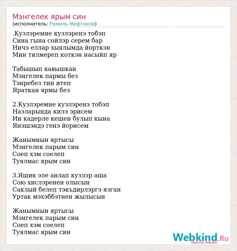 .Кузлэремне кузлэренэ тобэп Сина гына сойлэр серем бар Ничэ еллар хыялымда йорткэн Мин тилмереп коткэн насыйп яр Табышып кавышкан Мэнгелек пармы без Тэнребез тин итеп Яраткан ярмы без 2.Кузлэремне кузлэренэ тобэп Назларында килэ эрисем Ин кадерле кешен булып кына Янэшэндэ генэ йорисем Жанымнын яртысы Мэнгелек парым син Соеп хэм соелеп Туялмас ярым син 3.Яшик эле анлап кузлэр аша Сою хислэренен олысын Саклый белеп тэкъдирлэргэ язган Уртак мэхэббэтнен жылысын Жанымнын яртысы Мэнгелек парым син Соеп хэм соелеп Туялмас ярым син