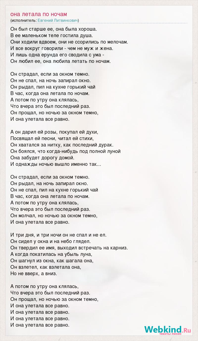 Он был старше ее, она была хороша. В ее маленьком теле гостила душа. Они ходили вдвоем, они не ссорились по мелочам. И все вокруг говорили - чем не муж и жена. И лишь одна ерунда его сводила с ума - Он любил ее, она любила летать по ночам. Он страдал, если за окном темно. Он не спал, на ночь запирал окно. Он рыдал, пил на кухне горький чай В час, когда она летала по ночам. А потом по утру она клялась, Что вчера это был последний раз. Он прощал, но ночью за окном темно, И она улетала все равно. А он дарил ей розы, покупал ей духи, Посвящал ей песни, читал ей стихи, Он хватался за нитку, как последний дурак. Он боялся, что когда-нибудь под полной луной Она забудет дорогу домой. И однажды ночью вышло именно так... Он страдал, если за окном темно. Он рыдал, на ночь запирал окно. Он не спал, пил на кухне горький чай В час, когда она летала по ночам. А потом по утру она клялась, Что вчера это был последний раз. Он молчал, но ночью за окном темно, И она улетала все равно. И три дня, и три ночи он не спал и не ел. Он сидел у окна и на небо глядел. Он твердил ее имя, выходил встречать на карниз. А когда покатилась на убыль луна, Он шагнул из окна, как шагала она, Он взлетел, как взлетала она, Но не вверх, а вниз. А потом по утру она клялась, Что вчера это был последний раз. Он прощал, но ночью за окном темно, И она улетала все равно. И она улетала все равно. И она улетала все равно. И она улетала все равно.