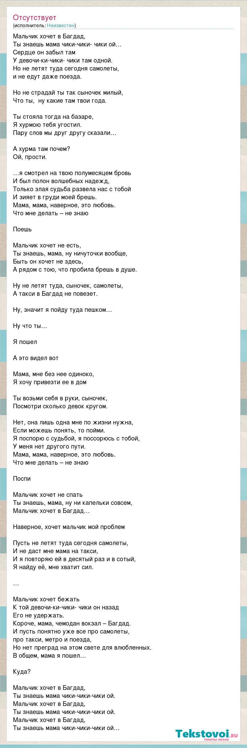 Мальчик хочет в Багдад, Ты знаешь мама чики-чики- чики ой… Сердце он забыл там У девочи-ки-чики- чики там одной. Но не летят туда сегодня самолеты, и не едут даже поезда. Но не страдай ты так сыночек милый, Что ты, ну какие там твои года. Ты стояла тогда на базаре, Я хурмою тебя угостил. Пару слов мы друг другу сказали… А хурма там почем? Ой, прости. …я смотрел на твою полумесяцем бровь И был полон волшебных надежд, Только злая судьба развела нас с тобой И зияет в груди моей брешь. Мама, мама, наверное, это любовь. Что мне делать – не знаю Поешь Мальчик хочет не есть, Ты знаешь, мама, ну ничуточки вообще, Быть он хочет не здесь, А рядом с тою, что пробила брешь в душе. Ну не летят туда, сыночек, самолеты, А такси в Багдад не повезет. Ну, значит я пойду туда пешком… Ну что ты… Я пошел А это видел вот Мама, мне без нее одиноко, Я хочу привезти ее в дом Ты возьми себя в руки, сыночек, Посмотри сколько девок кругом. Нет, она лишь одна мне по жизни нужна, Если можешь понять, то пойми. Я поспорю с судьбой, я поссорюсь с тобой, У меня нет другого пути. Мама, мама, наверное, это любовь. Что мне делать – не знаю Поспи Мальчик хочет не спать Ты знаешь, мама, ну ни капельки совсем, Мальчик хочет в Багдад… Наверное, хочет мальчик мой проблем Пусть не летят туда сегодня самолеты, И не даст мне мама на такси, И я повторяю ей в десятый раз и в сотый, Я найду её, мне хватит сил. … Мальчик хочет бежать К той девочи-ки-чики- чики он назад Его не удержать. Короче, мама, чемодан вокзал – Багдад. И пусть понятно уже все про самолеты, про такси, метро и поезда, Но нет преград на этом свете для влюбленных. В общем, мама я пошел… Куда? Мальчик хочет в Багдад, Ты знаешь мама чики-чики-чики ой. Мальчик хочет в Багдад, Ты знаешь мама чики-чики-чики ой. Мальчик хочет в Багдад, Ты знаешь мама чики-чики-чики ой…