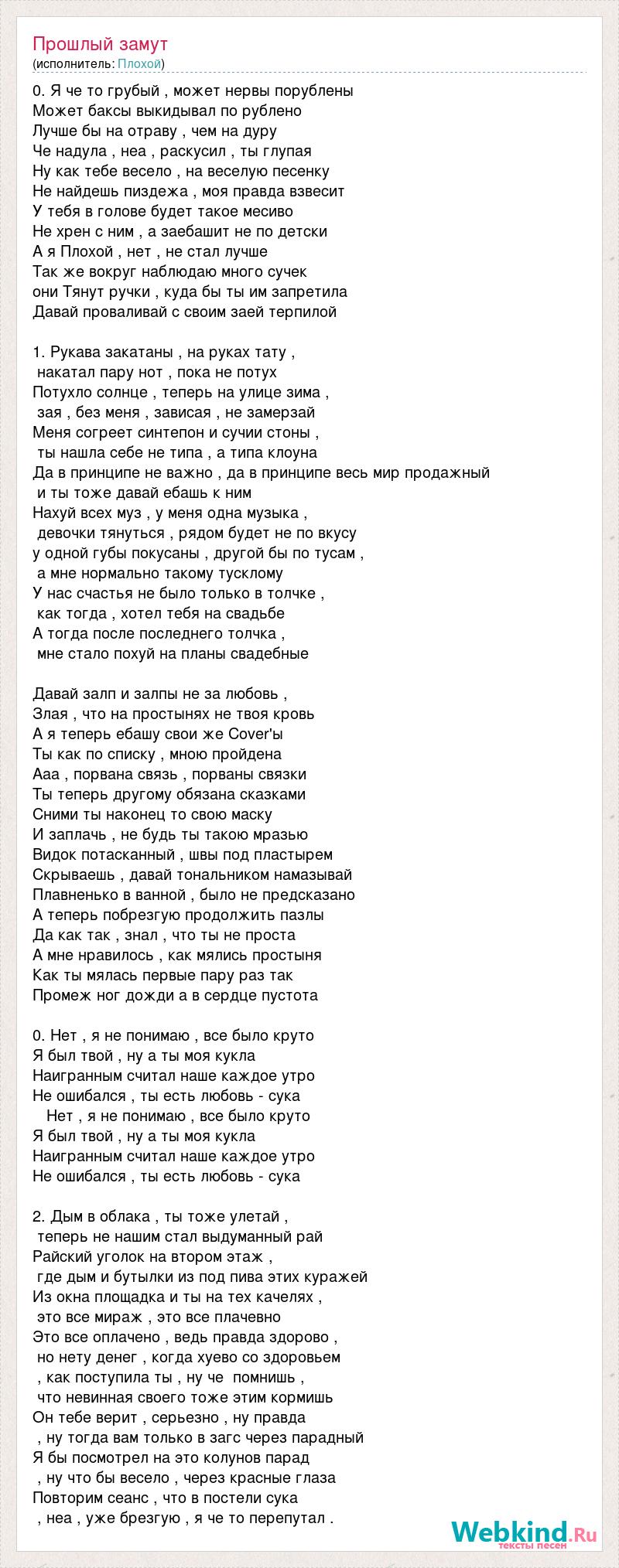 0. Я че то грубый , может нервы порублены Может баксы выкидывал по рублено Лучше бы на отраву , чем на дуру Че надула , неа , раскусил , ты глупая Ну как тебе весело , на веселую песенку Не найдешь пиздежа , моя правда взвесит У тебя в голове будет такое месиво Не хрен с ним , а заебашит не по детски А я Плохой , нет , не стал лучше Так же вокруг наблюдаю много сучек они Тянут ручки , куда бы ты им запретила Давай проваливай с своим заей терпилой 1. Рукава закатаны , на руках тату , накатал пару нот , пока не потух Потухло солнце , теперь на улице зима , зая , без меня , зависая , не замерзай Меня согреет синтепон и сучии стоны , ты нашла себе не типа , а типа клоуна Да в принципе не важно , да в принципе весь мир продажный и ты тоже давай ебашь к ним Нахуй всех муз , у меня одна музыка , девочки тянуться , рядом будет не по вкусу у одной губы покусаны , другой бы по тусам , а мне нормально такому тусклому У нас счастья не было только в толчке , как тогда , хотел тебя на свадьбе А тогда после последнего толчка , мне стало похуй на планы свадебные Давай залп и залпы не за любовь , Злая , что на простынях не твоя кровь А я теперь ебашу свои же Cover'ы Ты как по списку , мною пройдена Ааа , порвана связь , порваны связки Ты теперь другому обязана сказками Сними ты наконец то свою маску И заплачь , не будь ты такою мразью Видок потасканный , швы под пластырем Скрываешь , давай тональником намазывай Плавненько в ванной , было не предсказано А теперь побрезгую продолжить пазлы Да как так , знал , что ты не проста А мне нравилось , как мялись простыня Как ты мялась первые пару раз так Промеж ног дожди а в сердце пустота 0. Нет , я не понимаю , все было круто Я был твой , ну а ты моя кукла Наигранным считал наше каждое утро Не ошибался , ты есть любовь - сука Нет , я не понимаю , все было круто Я был твой , ну а ты моя кукла Наигранным считал наше каждое утро Не ошибался , ты есть любовь - сука 2. Дым в облака , ты тоже улетай , теперь не нашим стал выдуманный рай Райский уголок на втором этаж , где дым и бутылки из под пива этих куражей Из окна площадка и ты на тех качелях , это все мираж , это все плачевно Это все оплачено , ведь правда здорово , но нету денег , когда хуево со здоровьем , как поступила ты , ну че помнишь , что невинная своего тоже этим кормишь Он тебе верит , серьезно , ну правда , ну тогда вам только в загс через парадный Я бы посмотрел на это колунов парад , ну что бы весело , через красные глаза Повторим сеанс , что в постели сука , неа , уже брезгую , я че то перепутал .
