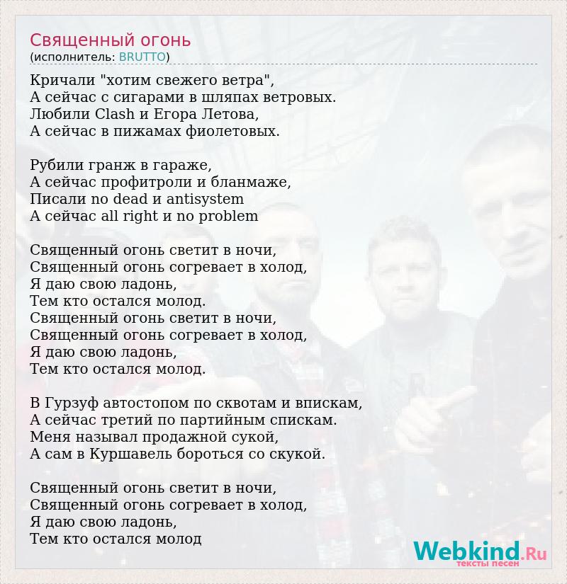 Кричали "хотим свежего ветра", А сейчас с сигарами в шляпах ветровых. Любили Clash и Егора Летова, А сейчас в пижамах фиолетовых. Рубили гранж в гараже, А сейчас профитроли и бланмаже, Писали no dead и antisystem А сейчас all right и no problem Священный огонь светит в ночи, Священный огонь согревает в холод, Я даю свою ладонь, Тем кто остался молод. Священный огонь светит в ночи, Священный огонь согревает в холод, Я даю свою ладонь, Тем кто остался молод. В Гурзуф автостопом по сквотам и впискам, А сейчас третий по партийным спискам. Меня называл продажной сукой, А сам в Куршавель бороться со скукой. Священный огонь светит в ночи, Священный огонь согревает в холод, Я даю свою ладонь, Тем кто остался молод