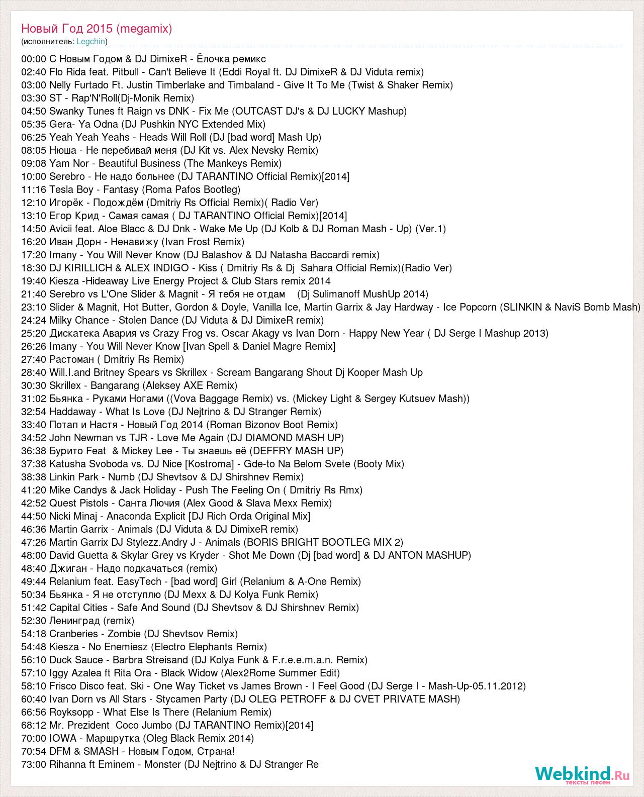 00:00 С Новым Годом & DJ DimixeR - Ёлочка ремикс 02:40 Flo Rida feat. Pitbull - Can't Believe It (Eddi Royal ft. DJ DimixeR & DJ Viduta remix) 03:00 Nelly Furtado Ft. Justin Timberlake and Timbaland - Give It To Me (Twist & Shaker Remix) 03:30 ST - Rap'N'Roll(Dj-Monik Remix) 04:50 Swanky Tunes ft Raign vs DNK - Fix Me (OUTCAST DJ's & DJ LUCKY Mashup) 05:35 Gera- Ya Odna (DJ Pushkin NYC Extended Mix) 06:25 Yeah Yeah Yeahs - Heads Will Roll (DJ [bad word] Mash Up) 08:05 Нюша - Не перебивай меня (DJ Kit vs. Alex Nevsky Remix) 09:08 Yam Nor - Beautiful Business (The Mankeys Remix) 10:00 Serebro - Не надо больнее (DJ TARANTINO Official Remix)[2014] 11:16 Tesla Boy - Fantasy (Roma Pafos Bootleg) 12:10 Игорёк - Подождём (Dmitriy Rs Official Remix)( Radio Ver) 13:10 Егор Крид - Самая самая ( DJ TARANTINO Official Remix)[2014] 14:50 Avicii feat. Aloe Blacc & DJ Dnk - Wake Me Up (DJ Kolb & DJ Roman Mash - Up) (Ver.1) 16:20 Иван Дорн - Ненавижу (Ivan Frost Remix) 17:20 Imany - You Will Never Know (DJ Balashov & DJ Natasha Baccardi remix) 18:30 DJ KIRILLICH & ALEX INDIGO - Kiss ( Dmitriy Rs & Dj Sahara Official Remix)(Radio Ver) 19:40 Kiesza -Hideaway Live Energy Project & Club Stars remix 2014 21:40 Serebro vs L'One Slider & Magnit - Я тебя не отдам (Dj Sulimanoff MushUp 2014) 23:10 Slider & Magnit, Hot Butter, Gordon & Doyle, Vanilla Ice, Martin Garrix & Jay Hardway - Ice Popcorn (SLINKIN & NaviS Bomb Mash) 24:24 Milky Chance - Stolen Dance (DJ Viduta & DJ DimixeR remix) 25:20 Дискатека Авария vs Crazy Frog vs. Oscar Akagy vs Ivan Dorn - Happy New Year ( DJ Serge I Mashup 2013) 26:26 Imany - You Will Never Know [Ivan Spell & Daniel Magre Remix] 27:40 Растоман ( Dmitriy Rs Remix) 28:40 Will.I.and Britney Spears vs Skrillex - Scream Bangarang Shout Dj Kooper Mash Up 30:30 Skrillex - Bangarang (Aleksey AXE Remix) 31:02 Бьянка - Руками Ногами ((Vova Baggage Remix) vs. (Mickey Light & Sergey Kutsuev Mash)) 32:54 Haddaway - What Is Love (DJ Nejtrino & DJ Stranger Remix) 33:40 Потап и Настя - Новый Год 2014 (Roman Bizonov Boot Remix) 34:52 John Newman vs TJR - Love Me Again (DJ DIAMOND MASH UP) 36:38 Бурито Feat & Mickey Lee - Ты знаешь её (DEFFRY MASH UP) 37:38 Katusha Svoboda vs. DJ Nice [Kostroma] - Gde-to Na Belom Svete (Booty Mix) 38:38 Linkin Park - Numb (DJ Shevtsov & DJ Shirshnev Remix) 41:20 Mike Candys & Jack Holiday - Push The Feeling On ( Dmitriy Rs Rmx) 42:52 Quest Pistols - Санта Лючия (Alex Good & Slava Mexx Remix) 44:50 Nicki Minaj - Anaconda Explicit [DJ Rich Orda Original Mix] 46:36 Martin Garrix - Animals (DJ Viduta & DJ DimixeR remix) 47:26 Martin Garrix DJ Stylezz.Andry J - Animals (BORIS BRIGHT BOOTLEG MIX 2) 48:00 David Guetta & Skylar Grey vs Kryder - Shot Me Down (Dj [bad word] & DJ ANTON MASHUP) 48:40 Джиган - Надо подкачаться (remix) 49:44 Relanium feat. EasyTech - [bad word] Girl (Relanium & A-One Remix) 50:34 Бьянка - Я не отступлю (DJ Mexx & DJ Kolya Funk Remix) 51:42 Capital Cities - Safe And Sound (DJ Shevtsov & DJ Shirshnev Remix) 52:30 Ленинград (remix) 54:18 Cranberies - Zombie (DJ Shevtsov Remix) 54:48 Kiesza - No Enemiesz (Electro Elephants Remix) 56:10 Duck Sauce - Barbra Streisand (DJ Kolya Funk & F.r.e.e.m.a.n. Remix) 57:10 Iggy Azalea ft Rita Ora - Black Widow (Alex2Rome Summer Edit) 58:10 Frisco Disco feat. Ski - One Way Ticket vs James Brown - I Feel Good (DJ Serge I - Mash-Up-05.11.2012) 60:40 Ivan Dorn vs All Stars - Stycamen Party (DJ OLEG PETROFF & DJ CVET PRIVATE MASH) 66:56 Royksopp - What Else Is There (Relanium Remix) 68:12 Mr. Prezident Coco Jumbo (DJ TARANTINO Remix)[2014] 70:00 IOWA - Маршрутка (Oleg Black Remix 2014) 70:54 DFM & SMASH - Новым Годом, Страна! 73:00 Rihanna ft Eminem - Monster (DJ Nejtrino & DJ Stranger Re