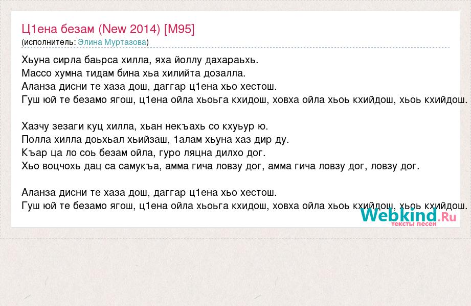 Хьуна сирла баьрса хилла, яха йоллу дахараьхь. Массо хумна тидам бина хьа хилийта дозалла. Аланза дисни те хаза дош, даггар ц1ена хьо хестош. Гуш юй те безамо ягош, ц1ена ойла хьоьга кхидош, ховха ойла хьоь кхийдош, хьоь кхийдош. Хазчу зезаги куц хилла, хьан некъахь со кхуьур ю. Полла хилла доьхьал хьийзаш, 1алам хьуна хаз дир ду. Къар ца ло соь безам ойла, гуро ляцна дилхо дог. Хьо воцчохь дац са самукъа, амма гича ловзу дог, амма гича ловзу дог, ловзу дог. Аланза дисни те хаза дош, даггар ц1ена хьо хестош. Гуш юй те безамо ягош, ц1ена ойла хьоьга кхидош, ховха ойла хьоь кхийдош, хьоь кхийдош.
