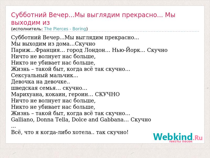 Субботний Вечер...Мы выглядим прекрасно... Мы выходим из дома…Скучно Париж...Франция… город Лондон… Нью-Йорк… Скучно Ничто не волнует нас больше, Никто не убивает нас больше, Жизнь – такой быт, когда всё так скучно… Сексуальный мальчик... Девочка на девочке.. шведская семья… скучно… Марихуана, кокаин, героин… СКУЧНО Ничто не волнует нас больше, Никто не убивает нас больше, Жизнь – такой быт, когда всё так скучно… Galliano, Donna Tella, Dolce and Gabbana… Скучно ... Всё, что я когда-либо хотела.. так скучно!