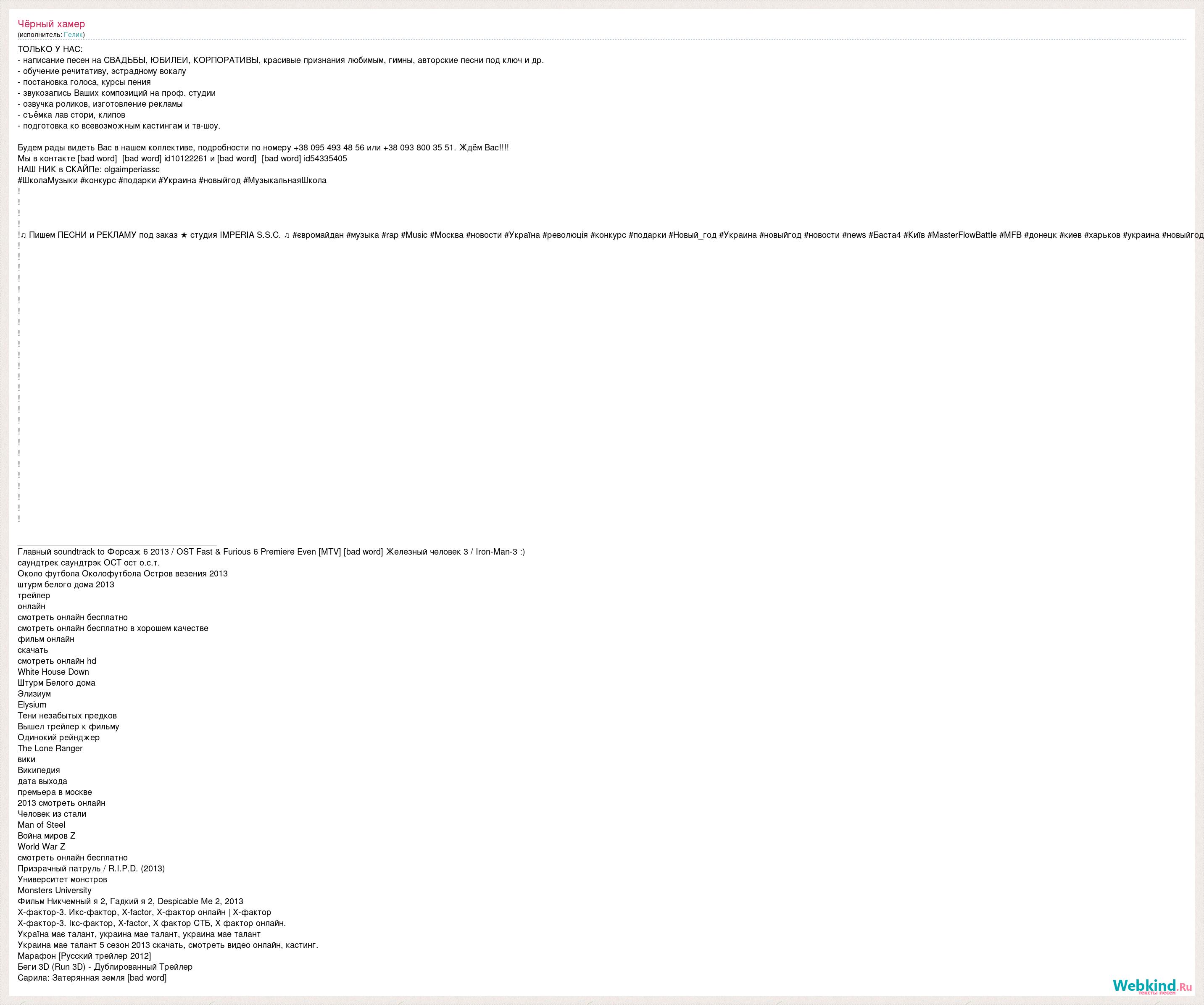 ТОЛЬКО У НАС: - написание песен на СВАДЬБЫ, ЮБИЛЕИ, КОРПОРАТИВЫ, красивые признания любимым, гимны, авторские песни под ключ и др. - обучение речитативу, эстрадному вокалу - постановка голоса, курсы пения - звукозапись Ваших композиций на проф. студии - озвучка роликов, изготовление рекламы - съёмка лав стори, клипов - подготовка ко всевозможным кастингам и тв-шоу. Будем рады видеть Вас в нашем коллективе, подробности по номеру +38 095 493 48 56 или +38 093 800 35 51. Ждём Вас!!!! Мы в контакте [bad word] [bad word] id10122261 и [bad word] [bad word] id54335405 НАШ НИК в СКАЙПе: olgaimperiassc #ШколаМузыки #конкурс #подарки #Украина #новыйгод #МузыкальнаяШкола ! ! ! ! !♫ Пишем ПЕСНИ и РЕКЛАМУ под заказ ★ студия IMPERIA S.S.C. ♫ #євромайдан #музыка #rap #Music #Москва #новости #Україна #революція #конкурс #подарки #Новый_год #Украина #новыйгод #новости #news #Баста4 #Київ #MasterFlowBattle #MFB #донецк #киев #харьков #украина #новыйгод ! ! ! ! ! ! ! ! ! ! ! ! ! ! ! ! ! ! ! ! ! ! ! ! ! ! ___________________________________________ Главный soundtrack to Форсаж 6 2013 / OST Fast & Furious 6 Premiere Even [MTV] [bad word] Железный человек 3 / Iron-Man-3 :) саундтрек саундтрэк ОСТ ост о.с.т. Около футбола Околофутбола Остров везения 2013 штурм белого дома 2013 трейлер онлайн смотреть онлайн бесплатно смотреть онлайн бесплатно в хорошем качестве фильм онлайн скачать смотреть онлайн hd White House Down Штурм Белого дома Элизиум Elysium Тени незабытых предков Вышел трейлер к фильму Одинокий рейнджер The Lone Ranger вики Википедия дата выхода премьера в москве 2013 смотреть онлайн Человек из стали Man of Steel Война миров Z World War Z смотреть онлайн бесплатно Призрачный патруль / R.I.P.D. (2013) Университет монстров Monsters University Фильм Никчемный я 2, Гадкий я 2, Despicable Me 2, 2013 Х-фактор-3. Икс-фактор, X-factor, Х-фактор онлайн | Х-фактор Х-фактор-3. Ікс-фактор, X-factor, Х фактор СТБ, Х фактор онлайн. Україна має талант, украина мае талант, украина мае талант Украина мае талант 5 сезон 2013 скачать, смотреть видео онлайн, кастинг. Марафон [Русский трейлер 2012] Беги 3D (Run 3D) - Дублированный Трейлер Сарила: Затерянная земля [bad word]