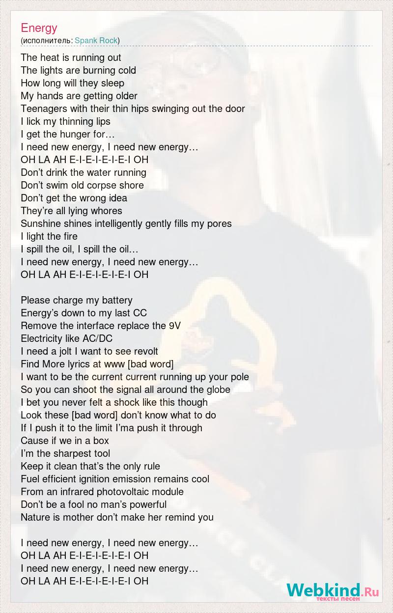 The heat is running out The lights are burning cold How long will they sleep My hands are getting older Teenagers with their thin hips swinging out the door I lick my thinning lips I get the hunger for… I need new energy, I need new energy… OH LA AH E-I-E-I-E-I-E-I OH Don’t drink the water running Don’t swim old corpse shore Don’t get the wrong idea They’re all lying whores Sunshine shines intelligently gently fills my pores I light the fire I spill the oil, I spill the oil… I need new energy, I need new energy… OH LA AH E-I-E-I-E-I-E-I OH Please charge my battery Energy’s down to my last CC Remove the interface replace the 9V Electricity like AC/DC I need a jolt I want to see revolt Find More lyrics at www [bad word] I want to be the current current running up your pole So you can shoot the signal all around the globe I bet you never felt a shock like this though Look these [bad word] don’t know what to do If I push it to the limit I’ma push it through Cause if we in a box I’m the sharpest tool Keep it clean that’s the only rule Fuel efficient ignition emission remains cool From an infrared photovoltaic module Don’t be a fool no man’s powerful Nature is mother don’t make her remind you I need new energy, I need new energy… OH LA AH E-I-E-I-E-I-E-I OH I need new energy, I need new energy… OH LA AH E-I-E-I-E-I-E-I OH