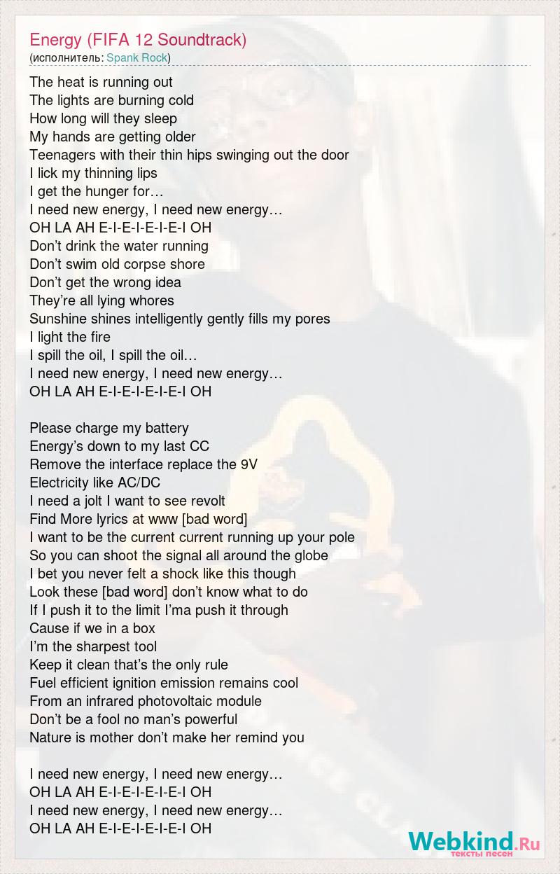 The heat is running out The lights are burning cold How long will they sleep My hands are getting older Teenagers with their thin hips swinging out the door I lick my thinning lips I get the hunger for… I need new energy, I need new energy… OH LA AH E-I-E-I-E-I-E-I OH Don’t drink the water running Don’t swim old corpse shore Don’t get the wrong idea They’re all lying whores Sunshine shines intelligently gently fills my pores I light the fire I spill the oil, I spill the oil… I need new energy, I need new energy… OH LA AH E-I-E-I-E-I-E-I OH Please charge my battery Energy’s down to my last CC Remove the interface replace the 9V Electricity like AC/DC I need a jolt I want to see revolt Find More lyrics at www [bad word] I want to be the current current running up your pole So you can shoot the signal all around the globe I bet you never felt a shock like this though Look these [bad word] don’t know what to do If I push it to the limit I’ma push it through Cause if we in a box I’m the sharpest tool Keep it clean that’s the only rule Fuel efficient ignition emission remains cool From an infrared photovoltaic module Don’t be a fool no man’s powerful Nature is mother don’t make her remind you I need new energy, I need new energy… OH LA AH E-I-E-I-E-I-E-I OH I need new energy, I need new energy… OH LA AH E-I-E-I-E-I-E-I OH