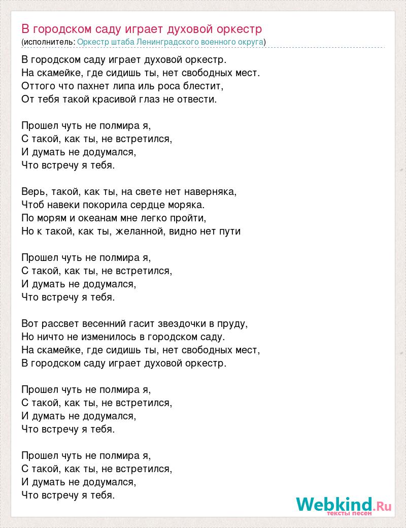 В городском саду играет духовой оркестр. На скамейке, где сидишь ты, нет свободных мест. Оттого что пахнет липа иль роса блестит, От тебя такой красивой глаз не отвести. Прошел чуть не полмира я, С такой, как ты, не встретился, И думать не додумался, Что встречу я тебя. Верь, такой, как ты, на свете нет наверняка, Чтоб навеки покорила сердце моряка. По морям и океанам мне легко пройти, Но к такой, как ты, желанной, видно нет пути Прошел чуть не полмира я, С такой, как ты, не встретился, И думать не додумался, Что встречу я тебя. Вот рассвет весенний гасит звездочки в пруду, Но ничто не изменилось в городском саду. На скамейке, где сидишь ты, нет свободных мест, В городском саду играет духовой оркестр. Прошел чуть не полмира я, С такой, как ты, не встретился, И думать не додумался, Что встречу я тебя. Прошел чуть не полмира я, С такой, как ты, не встретился, И думать не додумался, Что встречу я тебя.