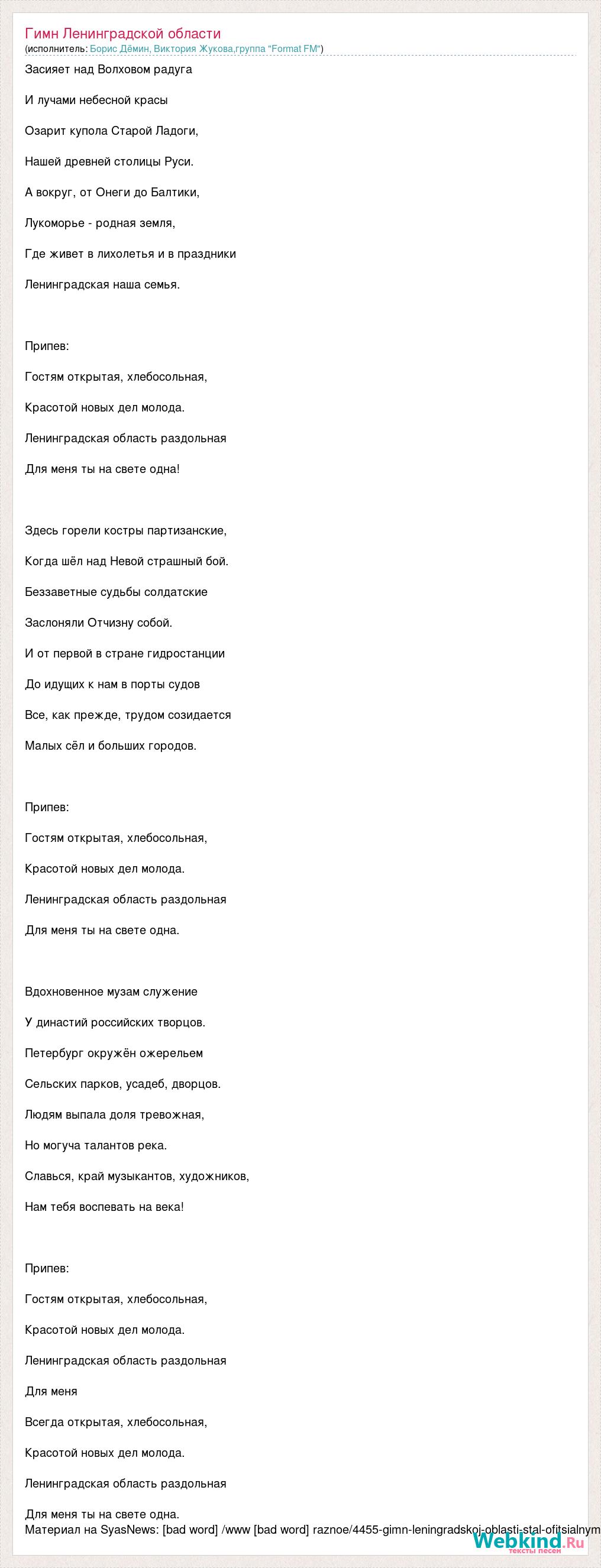 Засияет над Волховом радуга И лучами небесной красы Озарит купола Старой Ладоги, Нашей древней столицы Руси. А вокруг, от Онеги до Балтики, Лукоморье - родная земля, Где живет в лихолетья и в праздники Ленинградская наша семья. Припев: Гостям открытая, хлебосольная, Красотой новых дел молода. Ленинградская область раздольная Для меня ты на свете одна! Здесь горели костры партизанские, Когда шёл над Невой страшный бой. Беззаветные судьбы солдатские Заслоняли Отчизну собой. И от первой в стране гидростанции До идущих к нам в порты судов Все, как прежде, трудом созидается Малых сёл и больших городов. Припев: Гостям открытая, хлебосольная, Красотой новых дел молода. Ленинградская область раздольная Для меня ты на свете одна. Вдохновенное музам служение У династий российских творцов. Петербург окружён ожерельем Сельских парков, усадеб, дворцов. Людям выпала доля тревожная, Но могуча талантов река. Славься, край музыкантов, художников, Нам тебя воспевать на века! Припев: Гостям открытая, хлебосольная, Красотой новых дел молода. Ленинградская область раздольная Для меня Всегда открытая, хлебосольная, Красотой новых дел молода. Ленинградская область раздольная Для меня ты на свете одна. Материал на SyasNews: [bad word] /www [bad word] raznoe/4455-gimn-leningradskoj-oblasti-stal-ofitsialnym