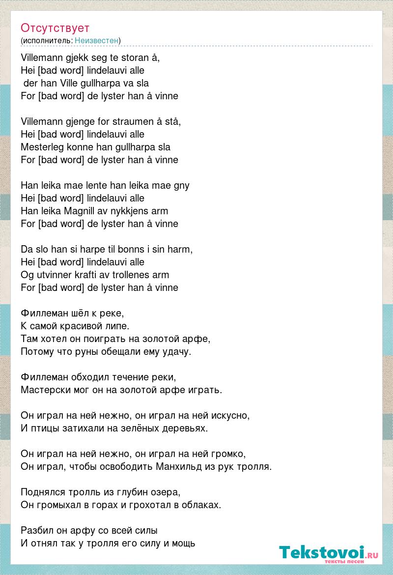 Villemann gjekk seg te storan å, Hei [bad word] lindelauvi alle der han Ville gullharpa va sla For de runerne de lyster han å vinne Villemann gjenge for straumen å stå, Hei [bad word] lindelauvi alle Mesterleg konne han gullharpa sla For de runerne de lyster han å vinne Han leika mae lente han leika mae gny Hei [bad word] lindelauvi alle Han leika Magnill av nykkjens arm For de runerne de lyster han å vinne Da slo han si harpe til bonns i sin harm, Hei [bad word] lindelauvi alle Og utvinner krafti av trollenes arm For de runerne de lyster han å vinne Филлеман шёл к реке, К самой красивой липе. Там хотел он поиграть на золотой арфе, Потому что руны обещали ему удачу. Филлеман обходил течение реки, Мастерски мог он на золотой арфе играть. Он играл на ней нежно, он играл на ней искусно, И птицы затихали на зелёных деревьях. Он играл на ней нежно, он играл на ней громко, Он играл, чтобы освободить Манхильд из рук тролля. Поднялся тролль из глубин озера, Он громыхал в горах и грохотал в облаках. Разбил он арфу со всей силы И отнял так у тролля его силу и мощь