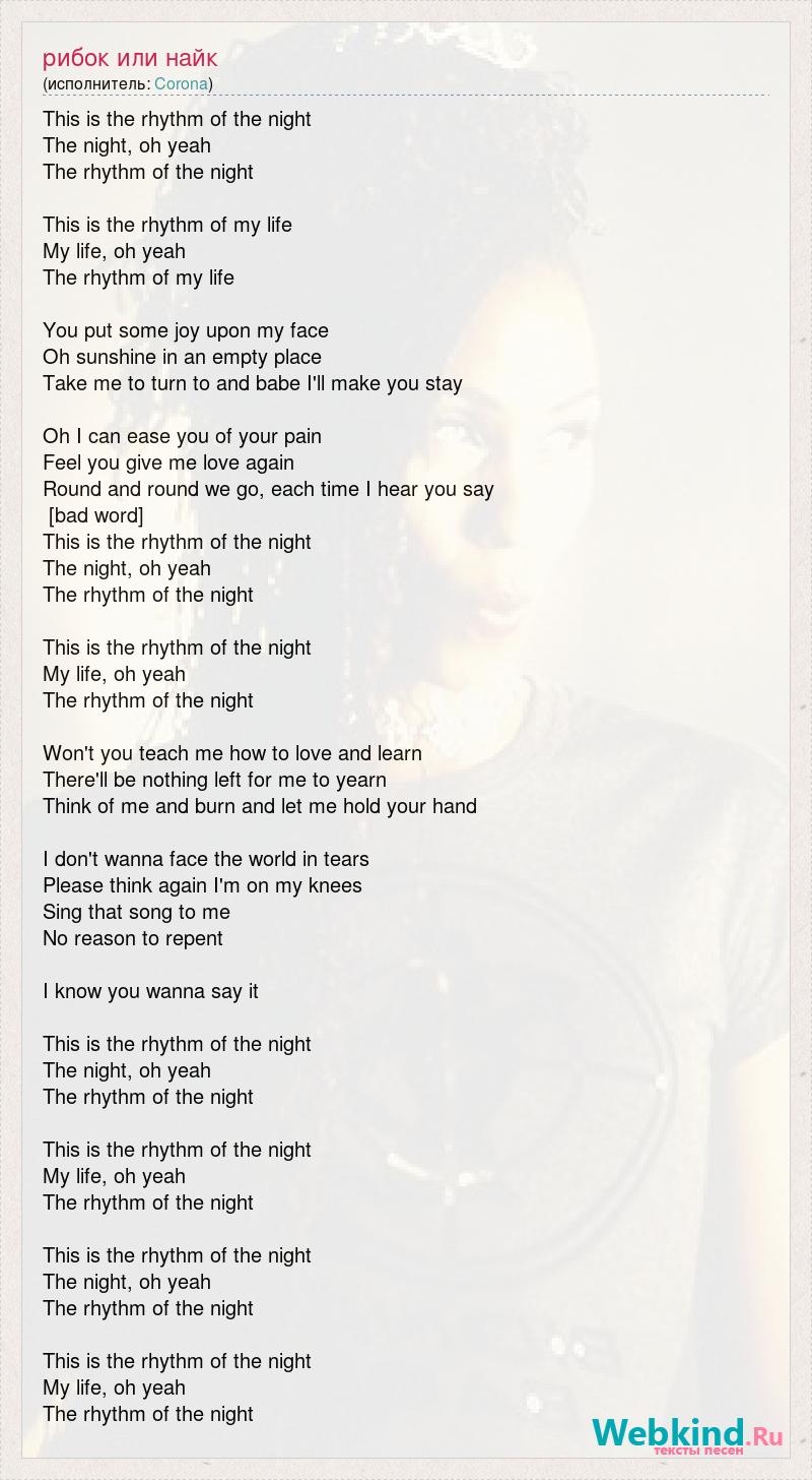 This is the rhythm of the night The night, oh yeah The rhythm of the night This is the rhythm of my life My life, oh yeah The rhythm of my life You put some joy upon my face Oh sunshine in an empty place Take me to turn to and babe I'll make you stay Oh I can ease you of your pain Feel you give me love again Round and round we go, each time I hear you say [bad word] This is the rhythm of the night The night, oh yeah The rhythm of the night This is the rhythm of the night My life, oh yeah The rhythm of the night Won't you teach me how to love and learn There'll be nothing left for me to yearn Think of me and burn and let me hold your hand I don't wanna face the world in tears Please think again I'm on my knees Sing that song to me No reason to repent I know you wanna say it This is the rhythm of the night The night, oh yeah The rhythm of the night This is the rhythm of the night My life, oh yeah The rhythm of the night This is the rhythm of the night The night, oh yeah The rhythm of the night This is the rhythm of the night My life, oh yeah The rhythm of the night