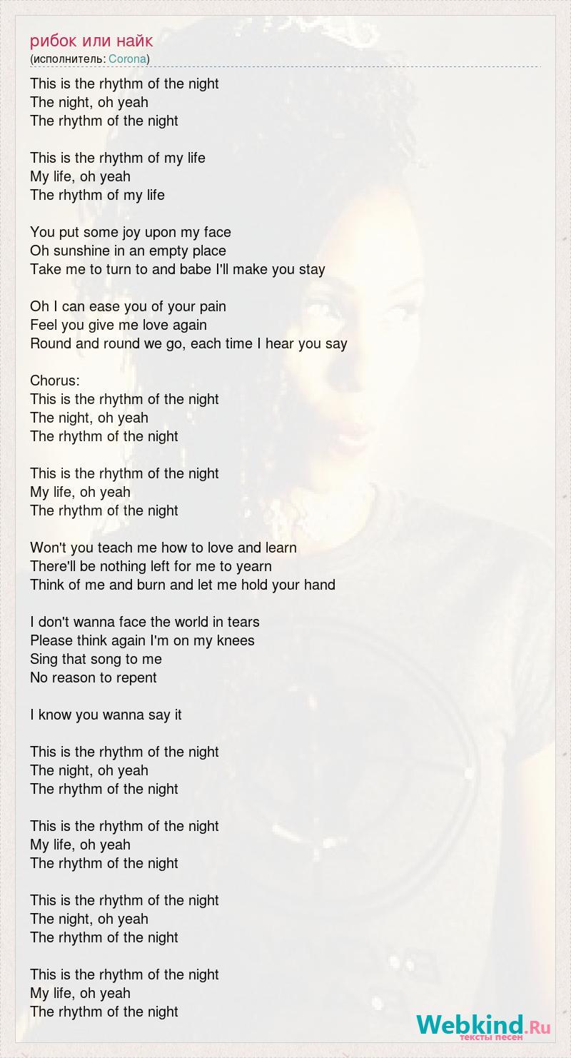 This is the rhythm of the night The night, oh yeah The rhythm of the night This is the rhythm of my life My life, oh yeah The rhythm of my life You put some joy upon my face Oh sunshine in an empty place Take me to turn to and babe I'll make you stay Oh I can ease you of your pain Feel you give me love again Round and round we go, each time I hear you say Chorus: This is the rhythm of the night The night, oh yeah The rhythm of the night This is the rhythm of the night My life, oh yeah The rhythm of the night Won't you teach me how to love and learn There'll be nothing left for me to yearn Think of me and burn and let me hold your hand I don't wanna face the world in tears Please think again I'm on my knees Sing that song to me No reason to repent I know you wanna say it This is the rhythm of the night The night, oh yeah The rhythm of the night This is the rhythm of the night My life, oh yeah The rhythm of the night This is the rhythm of the night The night, oh yeah The rhythm of the night This is the rhythm of the night My life, oh yeah The rhythm of the night