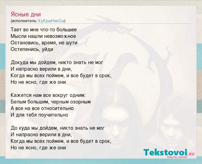 Тает во мне что-то большее Мысли нашли невозможное Остановись, время, не шути Остепенись, уйди Докуда мы дойдем, никто знать не мог И напрасно верили в дни, Когда мы всех поймем, и все будет в срок, Но не ясно, где же они Кажется нам все вокруг одним: Белым большим, черным озорным А все на все относительно И для тебя поучительно До куда мы дойдем, никто знать не мог И напрасно верили в дни, Когда мы всех поймем, и все будет в срок, Но не ясно, где же они