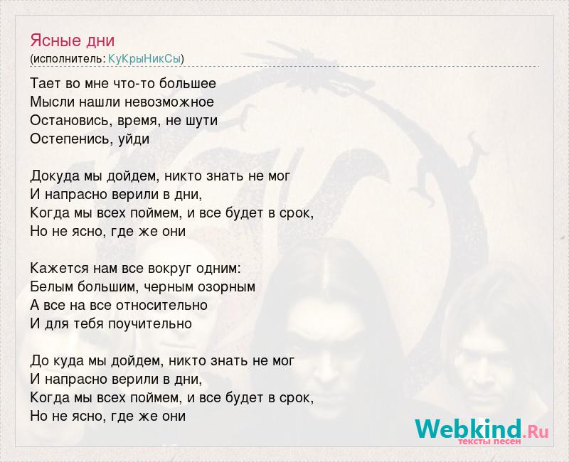 Тает во мне что-то большее Мысли нашли невозможное Остановись, время, не шути Остепенись, уйди Докуда мы дойдем, никто знать не мог И напрасно верили в дни, Когда мы всех поймем, и все будет в срок, Но не ясно, где же они Кажется нам все вокруг одним: Белым большим, черным озорным А все на все относительно И для тебя поучительно До куда мы дойдем, никто знать не мог И напрасно верили в дни, Когда мы всех поймем, и все будет в срок, Но не ясно, где же они