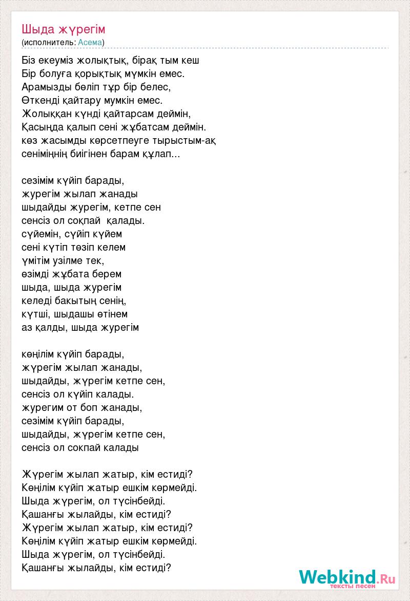 Біз екеуміз жолықтық, бірақ тым кеш Бір болуға қорықтық мүмкін емес. Арамызды бөліп тұр бір белес, Өткенді қайтару мумкін емес. Жолыққан күнді қайтарсам деймін, Қасыңда қалып сені жұбатсам деймін. көз жасымды көрсетпеуге тырыстым-ақ сеніміңнің биігінен барам құлап... сезімім күйіп барады, журегім жылап жанады шыдайды журегім, кетпе сен сенсіз ол соқпай қалады. сүйемін, сүйіп күйем сені күтіп төзіп келем үмітім узілме тек, өзімді жұбата берем шыда, шыда журегім келеді бакытың сенің, күтші, шыдашы өтінем аз қалды, шыда журегім көңілім күйіп барады, жүрегім жылап жанады, шыдайды, жүрегім кетпе сен, сенсіз ол күйіп калады. журегим от боп жанады, сезімім күйіп барады, шыдайды, жүрегім кетпе сен, сенсіз ол сокпай калады Жүрегім жылап жатыр, кім естиді? Көңілім күйіп жатыр ешкім көрмейді. Шыда жүрегім, ол түсінбейді. Қашанғы жылайды, кім естиді? Жүрегім жылап жатыр, кім естиді? Көңілім күйіп жатыр ешкім көрмейді. Шыда жүрегім, ол түсінбейді. Қашанғы жылайды, кім естиді?