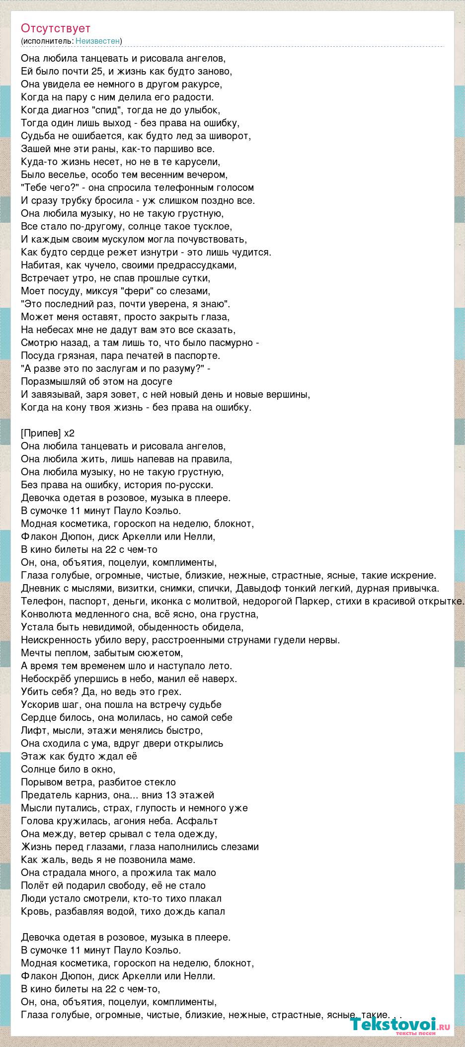 Она любила танцевать и рисовала ангелов, Ей было почти 25, и жизнь как будто заново, Она увидела ее немного в другом ракурсе, Когда на пару с ним делила его радости. Когда диагноз "спид", тогда не до улыбок, Тогда один лишь выход - без права на ошибку, Судьба не ошибается, как будто лед за шиворот, Зашей мне эти раны, как-то паршиво все. Куда-то жизнь несет, но не в те карусели, Было веселье, особо тем весенним вечером, "Тебе чего?" - она спросила телефонным голосом И сразу трубку бросила - уж слишком поздно все. Она любила музыку, но не такую грустную, Все стало по-другому, солнце такое тусклое, И каждым своим мускулом могла почувствовать, Как будто сердце режет изнутри - это лишь чудится. Набитая, как чучело, своими предрассудками, Встречает утро, не спав прошлые сутки, Моет посуду, миксуя "фери" со слезами, "Это последний раз, почти уверена, я знаю". Может меня оставят, просто закрыть глаза, На небесах мне не дадут вам это все сказать, Смотрю назад, а там лишь то, что было пасмурно - Посуда грязная, пара печатей в паспорте. "А разве это по заслугам и по разуму?" - Поразмышляй об этом на досуге И завязывай, заря зовет, с ней новый день и новые вершины, Когда на кону твоя жизнь - без права на ошибку. [Припев] x2 Она любила танцевать и рисовала ангелов, Она любила жить, лишь напевав на правила, Она любила музыку, но не такую грустную, Без права на ошибку, история по-русски. Девочка одетая в розовое, музыка в плеере. В сумочке 11 минут Пауло Коэльо. Модная косметика, гороскоп на неделю, блокнот, Флакон Дюпон, диск Аркелли или Нелли, В кино билеты на 22 с чем-то Он, она, объятия, поцелуи, комплименты, Глаза голубые, огромные, чистые, близкие, нежные, страстные, ясные, такие искрение. Дневник с мыслями, визитки, снимки, спички, Давыдоф тонкий легкий, дурная привычка. Телефон, паспорт, деньги, иконка с молитвой, недорогой Паркер, стихи в красивой открытке. Конволюта медленного сна, всё ясно, она грустна, Устала быть невидимой, обыденность обидела, Неискренность убило веру, расстроенными струнами гудели нервы. Мечты пеплом, забытым сюжетом, А время тем временем шло и наступало лето. Небоскрёб упершись в небо, манил её наверх. Убить себя? Да, но ведь это грех. Ускорив шаг, она пошла на встречу судьбе Сердце билось, она молилась, но самой себе Лифт, мысли, этажи менялись быстро, Она сходила с ума, вдруг двери открылись Этаж как будто ждал её Солнце било в окно, Порывом ветра, разбитое стекло Предатель карниз, она... вниз 13 этажей Мысли путались, страх, глупость и немного уже Голова кружилась, агония неба. Асфальт Она между, ветер срывал с тела одежду, Жизнь перед глазами, глаза наполнились слезами Как жаль, ведь я не позвонила маме. Она страдала много, а прожила так мало Полёт ей подарил свободу, её не стало Люди устало смотрели, кто-то тихо плакал Кровь, разбавляя водой, тихо дождь капал Девочка одетая в розовое, музыка в плеере. В сумочке 11 минут Пауло Коэльо. Модная косметика, гороскоп на неделю, блокнот, Флакон Дюпон, диск Аркелли или Нелли. В кино билеты на 22 с чем-то, Он, она, объятия, поцелуи, комплименты, Глаза голубые, огромные, чистые, близкие, нежные, страстные, ясные, такие. . .