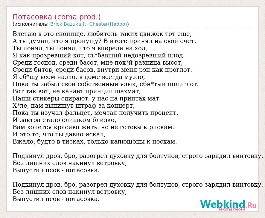 Влетаю в это скопище, любитель таких движек тот еще, А ты думал, что я пропущу? В итоге принял на свой счет. Ты понял, ты понял, что я впереди на ход, Я как прозревший кот, съ*бавший недозревший плод. Среди господ, среди басот, мне пох*й разница высот, Среди битов, среди басов, внутри меня рэп как проглот. Я еб*шу всем назло, в доме всегда музло, Пока ты забыл свой собственный язык, ебн*тый полиглот. Вот так вот, не канает принцип шахмат, Наши стикеры сдирают, у нас на принтах мат. Х*ле, нам выпишут штраф за концерт, Пока ты изучал фальцет, мечтая получить процент. И завтра стало слишком близко, Вам хочется красиво жить, но не готовы к рискам. И это то, что ты давно искал, Вжало, будто в тисках, только капюшоны к носкам. Подкинул дров, бро, разогрел духовку для болтунов, строго зарядил винтовку. Без лишних слов накинул ветровку, Выпустил псов - потасовка. Подкинул дров, бро, разогрел духовку для болтунов, строго зарядил винтовку. Без лишних слов накинул ветровку, Выпустил псов - потасовка.