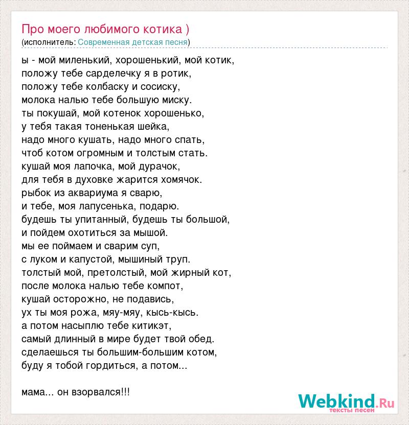 ы - мой миленький, хорошенький, мой котик, положу тебе сарделечку я в ротик, положу тебе колбаску и сосиску, молока налью тебе большую миску. ты покушай, мой котенок хорошенько, у тебя такая тоненькая шейка, надо много кушать, надо много спать, чтоб котом огромным и толстым стать. кушай моя лапочка, мой дурачок, для тебя в духовке жарится хомячок. рыбок из аквариума я сварю, и тебе, моя лапусенька, подарю. будешь ты упитанный, будешь ты большой, и пойдем охотиться за мышой. мы ее поймаем и сварим суп, с луком и капустой, мышиный труп. толстый мой, претолстый, мой жирный кот, после молока налью тебе компот, кушай осторожно, не подавись, ух ты моя рожа, мяу-мяу, кысь-кысь. а потом насыплю тебе китикэт, самый длинный в мире будет твой обед. сделаешься ты большим-большим котом, буду я тобой гордиться, а потом... мама... он взорвался!!!