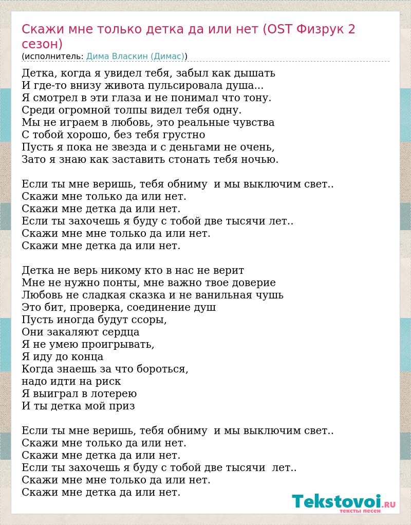 Детка, когда я увидел тебя, забыл как дышать И где-то внизу живота пульсировала душа... Я смотрел в эти глаза и не понимал что тону. Среди огромной толпы видел тебя одну. Мы не играем в любовь, это реальные чувства С тобой хорошо, без тебя грустно Пусть я пока не звезда и с деньгами не очень, Зато я знаю как заставить стонать тебя ночью. Если ты мне веришь, тебя обниму и мы выключим свет.. Скажи мне только да или нет. Скажи мне детка да или нет. Если ты захочешь я буду с тобой две тысячи лет.. Скажи мне мне только да или нет. Скажи мне детка да или нет. Детка не верь никому кто в нас не верит Мне не нужно понты, мне важно твое доверие Любовь не сладкая сказка и не ванильная чушь Это бит, проверка, соединение душ Пусть иногда будут ссоры, Они закаляют сердца Я не умею проигрывать, Я иду до конца Когда знаешь за что бороться, надо идти на риск Я выиграл в лотерею И ты детка мой приз Если ты мне веришь, тебя обниму и мы выключим свет.. Скажи мне только да или нет. Скажи мне детка да или нет. Если ты захочешь я буду с тобой две тысячи лет.. Скажи мне мне только да или нет. Скажи мне детка да или нет.
