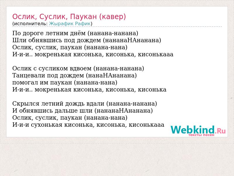 По дороге летним днём (нанана-нанана) Шли обнявшись под дождем (нананаНАнанана) Ослик, суслик, паукан (нанана-нана) И-и-и.. мокренькая кисонька, кисонька, кисонькааа Ослик с сусликом вдвоем (нанана-нанана) Танцевали под дождем (нанаНАнанана) помогал им паукан (нанана-нана) И-и-и.. мокренькая кисонька, кисонька, кисонька Скрылся летний дождь вдали (нанана-нанана) И обнявшись дальше шли (нананаНАнанана) Ослик, суслик, паукан (нанана-нана) И-и-и сухонькая кисонька, кисонька, кисонькааа