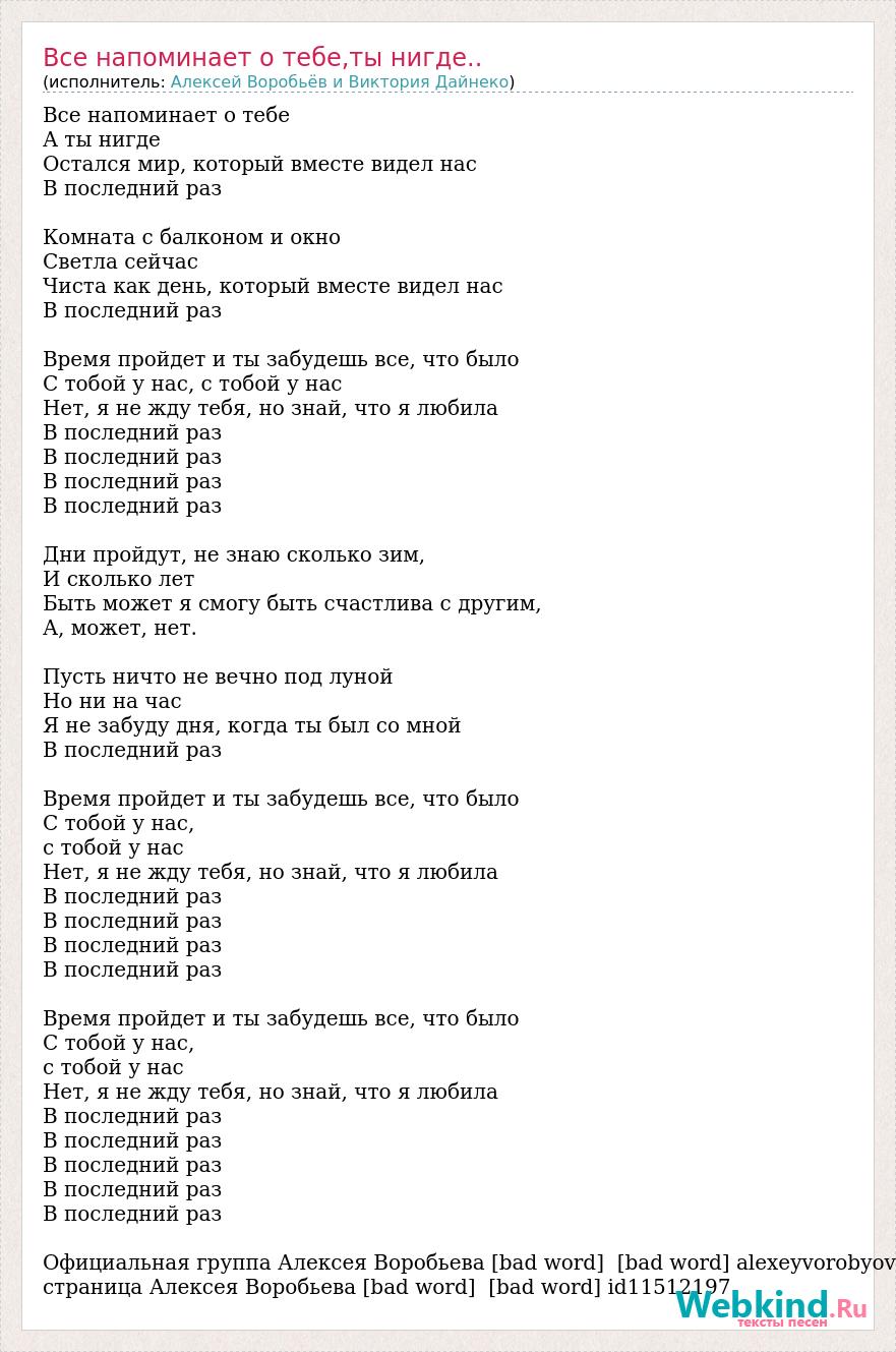 Все напоминает о тебе А ты нигде Остался мир, который вместе видел нас В последний раз Комната с балконом и окно Светла сейчас Чиста как день, который вместе видел нас В последний раз Время пройдет и ты забудешь все, что было С тобой у нас, с тобой у нас Нет, я не жду тебя, но знай, что я любила В последний раз В последний раз В последний раз В последний раз Дни пройдут, не знаю сколько зим, И сколько лет Быть может я смогу быть счастлива с другим, А, может, нет. Пусть ничто не вечно под луной Но ни на час Я не забуду дня, когда ты был со мной В последний раз Время пройдет и ты забудешь все, что было С тобой у нас, с тобой у нас Нет, я не жду тебя, но знай, что я любила В последний раз В последний раз В последний раз В последний раз Время пройдет и ты забудешь все, что было С тобой у нас, с тобой у нас Нет, я не жду тебя, но знай, что я любила В последний раз В последний раз В последний раз В последний раз В последний раз Официальная группа Алексея Воробьева [bad word] [bad word] alexeyvorobyov страница Алексея Воробьева [bad word] [bad word] id11512197