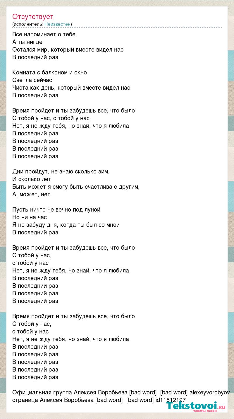 Все напоминает о тебе А ты нигде Остался мир, который вместе видел нас В последний раз Комната с балконом и окно Светла сейчас Чиста как день, который вместе видел нас В последний раз Время пройдет и ты забудешь все, что было С тобой у нас, с тобой у нас Нет, я не жду тебя, но знай, что я любила В последний раз В последний раз В последний раз В последний раз Дни пройдут, не знаю сколько зим, И сколько лет Быть может я смогу быть счастлива с другим, А, может, нет. Пусть ничто не вечно под луной Но ни на час Я не забуду дня, когда ты был со мной В последний раз Время пройдет и ты забудешь все, что было С тобой у нас, с тобой у нас Нет, я не жду тебя, но знай, что я любила В последний раз В последний раз В последний раз В последний раз Время пройдет и ты забудешь все, что было С тобой у нас, с тобой у нас Нет, я не жду тебя, но знай, что я любила В последний раз В последний раз В последний раз В последний раз В последний раз Официальная группа Алексея Воробьева [bad word] [bad word] alexeyvorobyov страница Алексея Воробьева [bad word] [bad word] id11512197