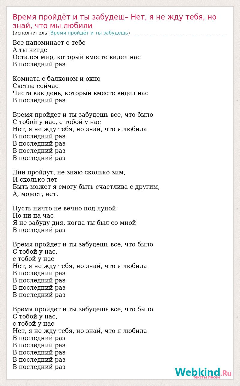 Главная→Исполнители→Время пройдёт и ты забудешь→Время пройдёт и ты забудеш– Нет, я не жду тебя, но знай, что мы любили