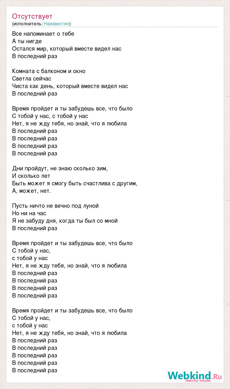 Все напоминает о тебе А ты нигде Остался мир, который вместе видел нас В последний раз Комната с балконом и окно Светла сейчас Чиста как день, который вместе видел нас В последний раз Время пройдет и ты забудешь все, что было С тобой у нас, с тобой у нас Нет, я не жду тебя, но знай, что я любила В последний раз В последний раз В последний раз В последний раз Дни пройдут, не знаю сколько зим, И сколько лет Быть может я смогу быть счастлива с другим, А, может, нет. Пусть ничто не вечно под луной Но ни на час Я не забуду дня, когда ты был со мной В последний раз Время пройдет и ты забудешь все, что было С тобой у нас, с тобой у нас Нет, я не жду тебя, но знай, что я любила В последний раз В последний раз В последний раз В последний раз Время пройдет и ты забудешь все, что было С тобой у нас, с тобой у нас Нет, я не жду тебя, но знай, что я любила В последний раз В последний раз В последний раз В последний раз В последний раз