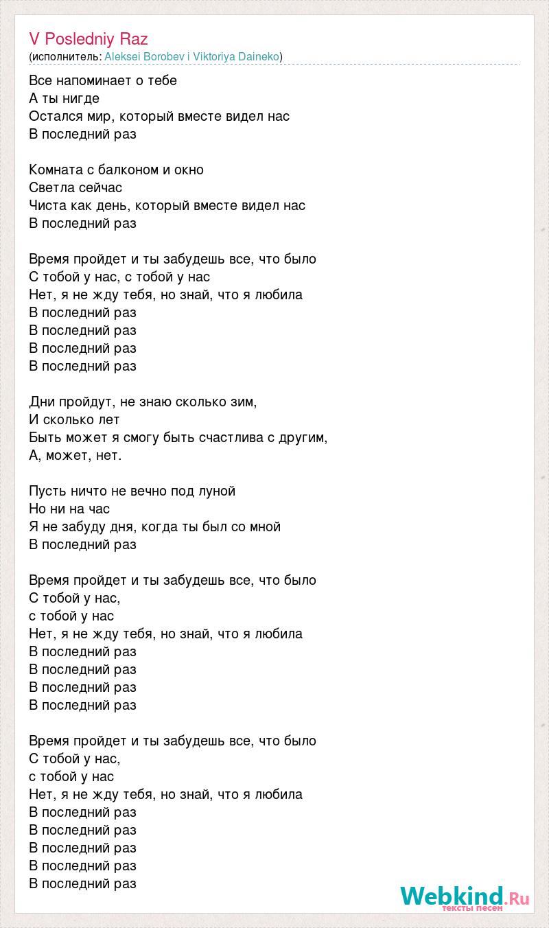Все напоминает о тебе А ты нигде Остался мир, который вместе видел нас В последний раз Комната с балконом и окно Светла сейчас Чиста как день, который вместе видел нас В последний раз Время пройдет и ты забудешь все, что было С тобой у нас, с тобой у нас Нет, я не жду тебя, но знай, что я любила В последний раз В последний раз В последний раз В последний раз Дни пройдут, не знаю сколько зим, И сколько лет Быть может я смогу быть счастлива с другим, А, может, нет. Пусть ничто не вечно под луной Но ни на час Я не забуду дня, когда ты был со мной В последний раз Время пройдет и ты забудешь все, что было С тобой у нас, с тобой у нас Нет, я не жду тебя, но знай, что я любила В последний раз В последний раз В последний раз В последний раз Время пройдет и ты забудешь все, что было С тобой у нас, с тобой у нас Нет, я не жду тебя, но знай, что я любила В последний раз В последний раз В последний раз В последний раз В последний раз
