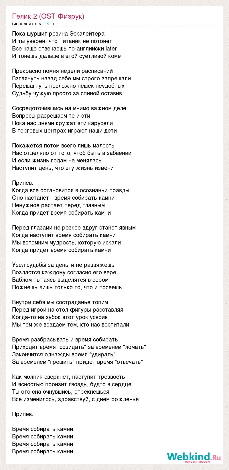 Пока шуршит резина Эскалейтера И ты уверен, что Титаник не потонет Все чаще отвечаешь по-английски later И тонешь дальше в этой суетливой коме Прекрасно помня недели расписаний Взглянуть назад себе мы строго запрещали Перешагнуть несложно пешек неудобных Судьбу чужую просто за спиной оставив Сосредоточившись на мнимо важном деле Вопросы разрешаем те и эти Пока нас днями кружат эти карусели В торговых центрах играют наши дети Покажется потом всего лишь малость Нас отделяло от того, чтоб быть в забвении И если жизнь годам не менялась Наступит день, что эту жизнь изменит Припев: Когда все остановится в осознаньи правды Оно настанет - время собирать камни Ненужное растает перед главным Когда придет время собирать камни Перед глазами не резкое вдруг станет явным Когда наступит время собирать камни Мы вспомним мудрость, которую искали Когда придет время собирать камни Узел судьбы за деньги не развяжешь Воздастся каждому согласно его вере Баблом пытаясь выделятся в сером Пожнешь лишь только то, что и посеешь Внутри себя мы состраданье топим Перед игрой на стол фигуры расставляя Когда-то на зубок этот урок усвоив Мы тем же воздаем тем, кто нас воспитали Время разбрасывать и время собирать Приходит время "созидать" за временем "ломать" Закончится однажды время "удирать" За временем "грешить" придет время "отвечать" Как молния сверкнет, наступит трезвость И ясностью пронзит гвоздь, будто в сердце Ты ото сна очнувшись, отрекнешься Все изменилось, здравствуй, с днем рожденья Припев. Время собирать камни Время собирать камни Время собирать камни Время собирать камни