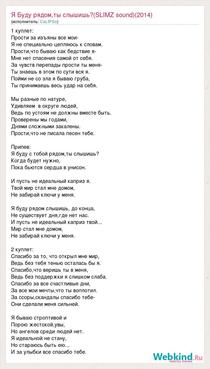 1 куплет: Прости за изъяны все мои- Я не специально цепляюсь к словам. Прости,что бываю как бедствие я- Мне нет спасения самой от себя. За чувств перепады прости ты меня- Ты знаешь в этом по сути вся я. Пойми не со зла я бываю груба, Ты принимаешь весь удар на себя. Мы разные по натуре, Удивляем в округе людей, Ведь по устоям не должны вместе быть. Проверены мы годами, Днями сложными закалены. Прости,что не писала песен тебе. Припев: Я буду с тобой рядом,ты слышишь? Когда будет нужно, Пока бьются сердца в унисон. И пусть не идеальный каприз я. Твой мир стал мне домом, Не забирай ключи у меня. Я буду рядом слышишь, до конца, Не существует дня,где нет нас. И пусть не идеальный каприз твой... Мир стал мне домом, Не забирай ключи у меня. 2 куплет: Спасибо за то, что открыл мне мир, Ведь без тебя тенью осталась бы я. Спасибо,что веришь ты в меня, Ведь без поддержки я слишком слаба. Спасибо за все счастливые дни, За все мои мечты,что ты воплотил. За ссоры,скандалы спасибо тебе- Они сделали меня сильней. Я бываю строптивой и Порою жестокой,увы, Но ангелов среди людей нет. Я идеальной не стану, Но стараюсь быть ею... И за улыбки все спасибо тебе.