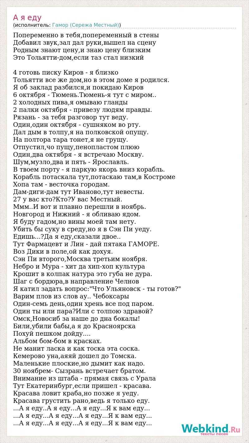 Попеременно в тебя,попеременный в стены Добавил звук,зал дал руки,вышел на сцену Родным знают цену,и знаю цену близким Это Тольятти-дом,если таз стал низкий 4 готовь писку Киров - я близко Тольятти все же дом,но в этом доме я родился. Я об заклад разбился,и покидаю Киров 6 октября - Тюмень.Тюмень-я тут с миром.. 2 холодных пива,я омываю гланды 2 палки октября - привезу людям правды. Рязань - за тебя разговор тут веду. Один,один октября - сушняком во рту. Дал дым в толпу,я на полковской опущу. На полтора тара тонет,я не грущу. Отпустил,чо пущу,пенопластом плюю Один,два октября - я встречаю Москву. Шум,музло,два и пять - Ярославль. В твоем порту - я паркую якорь вниз корабль. Корабль потаскала тут,потаскаю там,в Костроме Хопа там - весточка городам. Дам-диги-дам тут Иваново,тут невесты. 27 у вас кто?Кто?У вас Местный. Ммм..И вот и плавно перешли в ноябрь. Новгород и Нижний - я обливаю ядом. Я буду гадом,но вины моей там нету. Убить бы суку в среду,но я в Сэн Пи уеду. Едишь...?Да я еду,сказали двое.. Тут Фармацевт и Лин - дай пятака ГАМОРЕ. Воз Дики в поле,ой как дохуя. Сэн Пи второго,Москва третьим ноября. Небро и Мура - хит да хип-хоп культура Крошит в колпак натура это губа не дура. Шаг с бордюра,в направление Челнов Я катил задать вопрос:"Что Ульяновск - ты готов?" Варим плов из слов ау.. Чебоксары Один-семь день,один хрень все под паром. Один ты или пара?Или с толпою здравой? Омск,Новосиб за наше до дна бокалы! Били,убили бабы,а я до Красноярска Похуй пешком дойду.... Альбом бом-бом в красках. Не манит ласка и как тоска эта соска. Кемерово уна,аяяй дошел до Томска. Маленькие плоские,но дымит как надо. 30 ноябрем- Сызрань встречает братом. Внимание из штаба - прямая связь с Урала Тут Екатеринбург,если пришел - красава. Красава ловит краба,но позже я уеду. Красава грустить рано,ведь я только еду. ...А я еду..А я еду...А я еду...Я к вам еду... ...А я еду...А я еду...А я еду...Я к вам еду... ...А я еду...А я еду...А я еду...Я к вам еду...